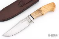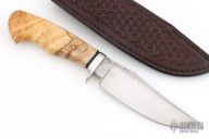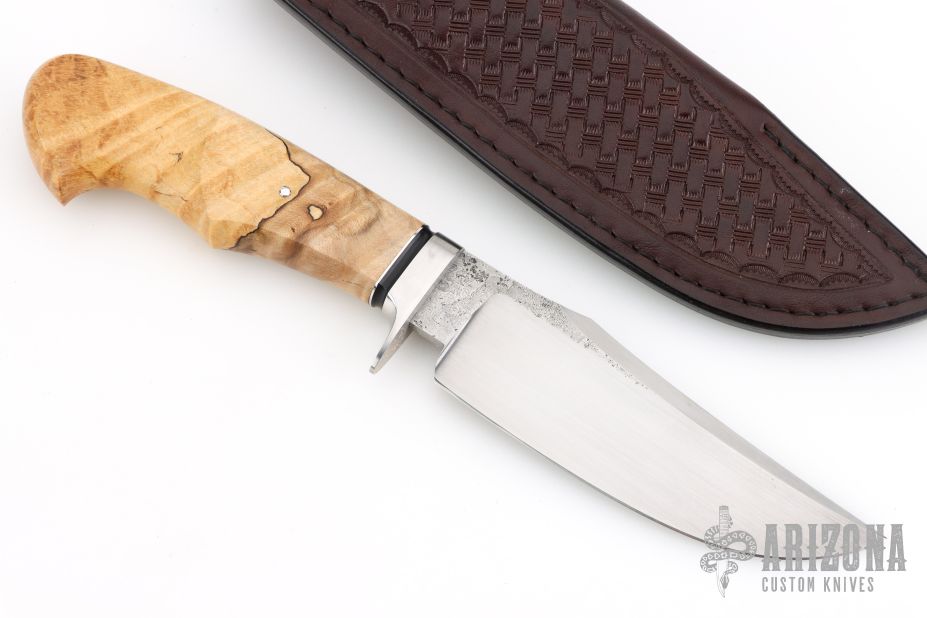 This Hunter by Milan Mozolic features a hand rub satin finished blade with forge finished flats, a light ghosty hamon, and a false top edge, .190" blade stock and 1.500" blade depth, hidden tang construction. The handle has a stainless steel guard with black G-10 and stainless steel spacer, beautiful stabilized figured and spalted maple burl grip with a single polished and domed stainless steel pin. Comes with a basket weave hand tooled black leather sheath. Comes with COA. Excellent condition. W5 tool steel w/ 59hrc.
