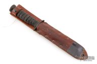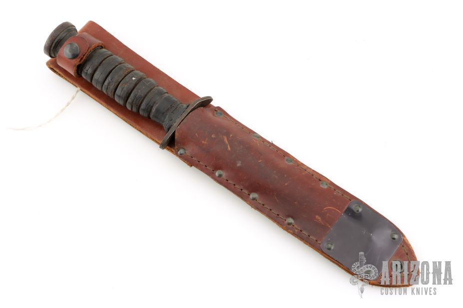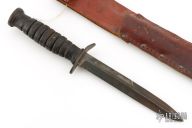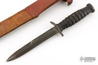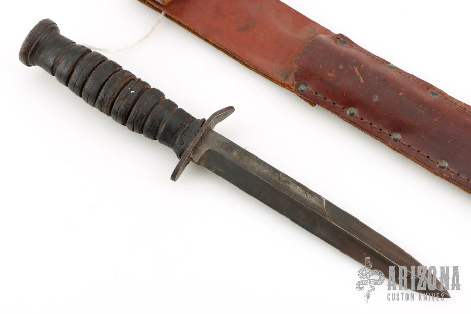 This M3 from Imperial features a black bayonet ground blade with sharpened top edge, .186" blade stock and .875" blade depth, hidden tang construction. The handle has a steel guard and butt, and a stacked leather grip. Comes with a brown leather Camillus scabbard with belt loop. This vintage knife has been used, carried and resharpened, otherwise in good condition for its age.