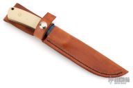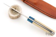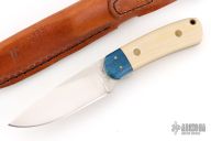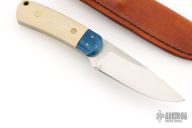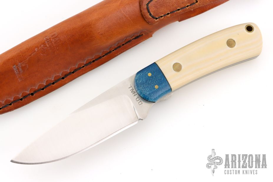 This knife by David Hall features a satin finish blade with .125" blade stock and 1.195" blade depth, full tang construction. The handle has blue micarta bolsters, and yellow paper micarta scales with lanyard hole in pommel. Comes with leather belt sheath. Has some light scratches, excellent condition otherwise.