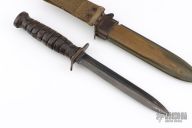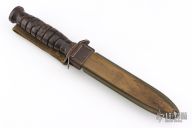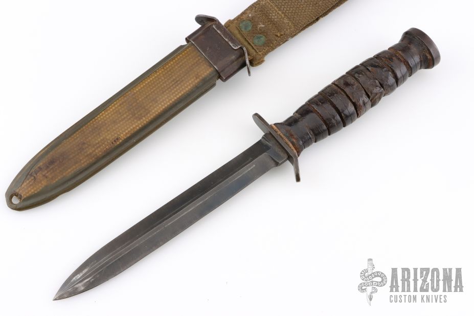 This M3 from Imperial features a black bayonet ground blade with sharpened top edge, .186" blade stock and .875" blade depth, hidden tang construction. The handle has a steel guard and butt, and a stacked leather grip. Comes with USM3 BMCO scabbard with belt loop. This vintage knife has been used, carried and resharpened, otherwise in good condition for its age. Item is unmarked but resembles the Imperial version, may be Utica - so both makers are tagged.