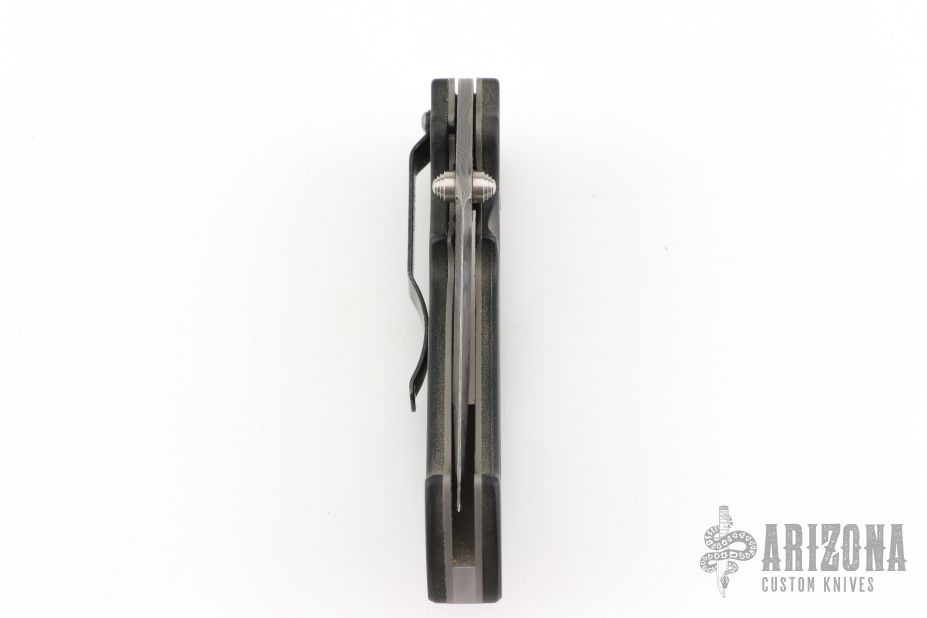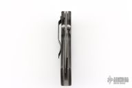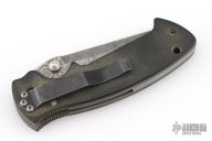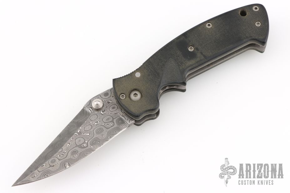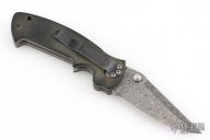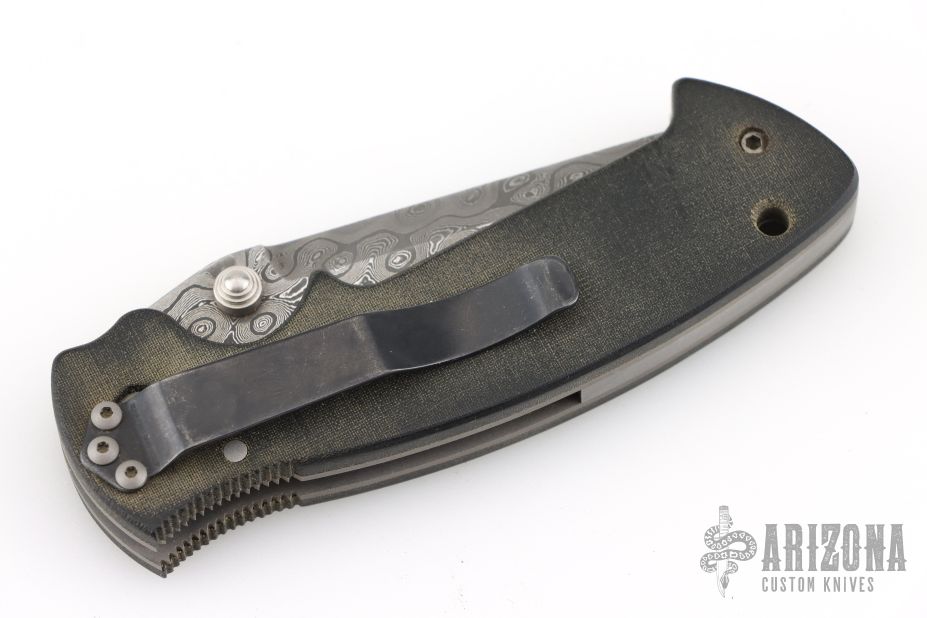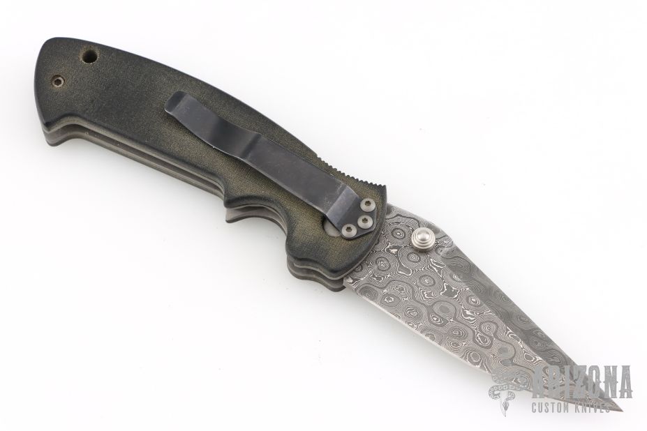 This Mini Kasper from Pat and Wes Crawford features a Damascus blade with false top edge and dual thumbstuds. The handle has green micarta covers, titanium liners, black tip up clip and lanyard hole in pommel. Nice lockup and blade seating. Comes with a Crawford nylon belt sheath. Has some light scratches, and patina, great overall condition.