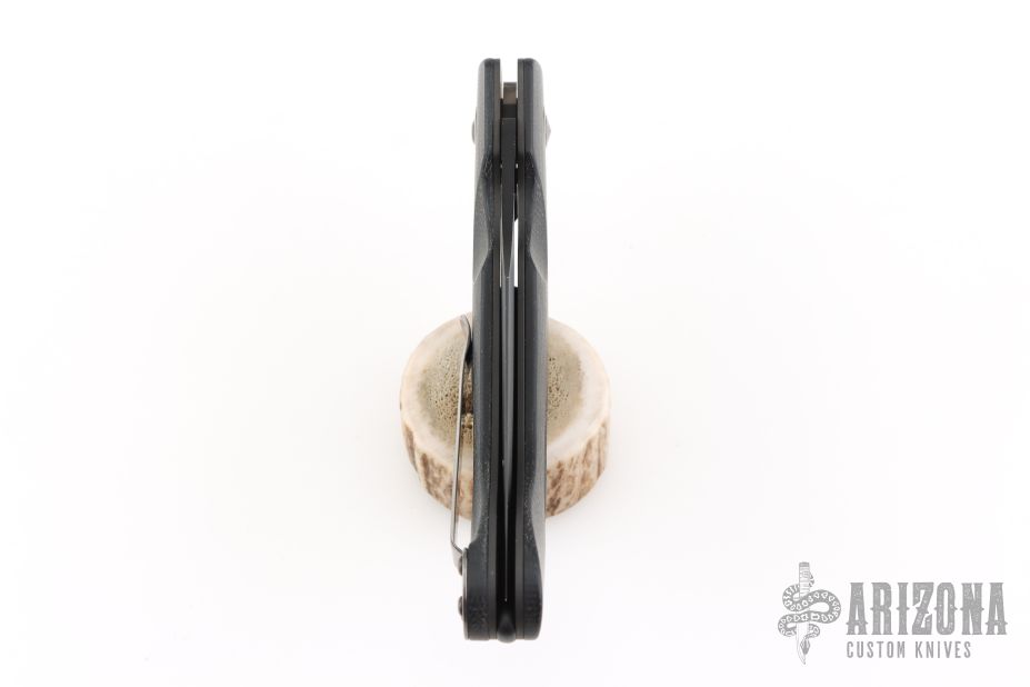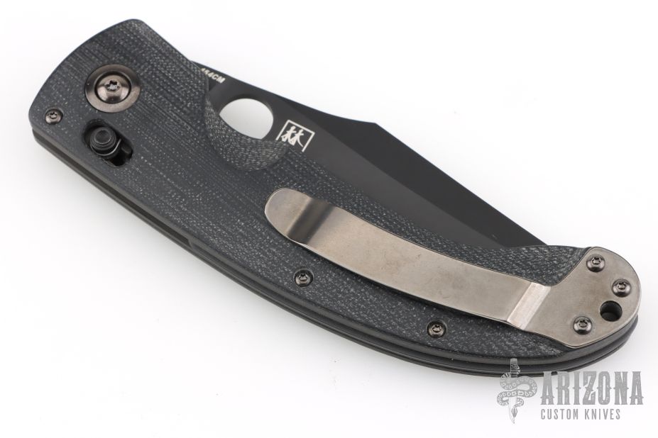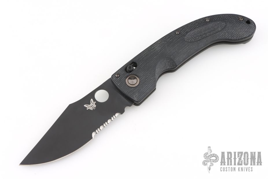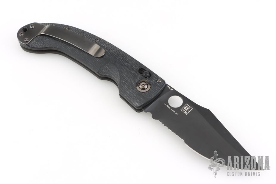 This 741 LUM Onslaught Axis Lock Folder has a black 154-CM serrated clip point blade with thumb hole. Handle is black G10 over stainless steel liners, black fiber backspacer, black stonewashed stainless steel tip up clip, and lanyard hole. Has some scuffs and scratches, good condition otherwise.