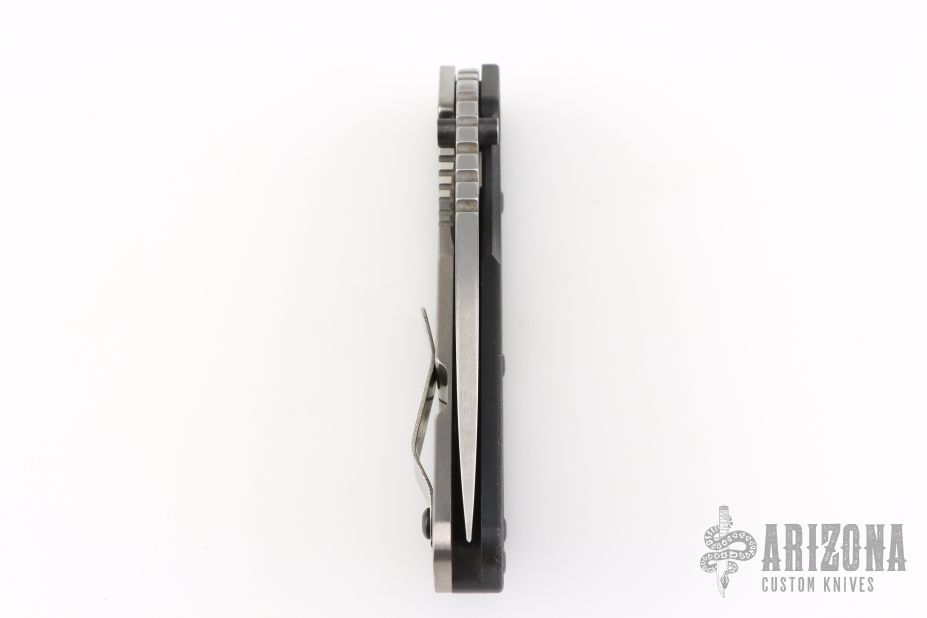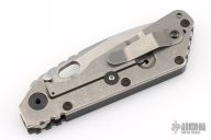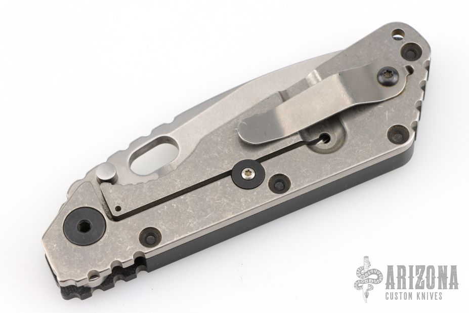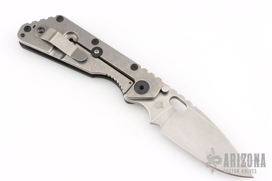 This SMF from Strider Knives features a stonewashed blade, textured black G-10, stonewash finished titanium handle and matching tip up titanium clip. Notches on thumbrest, rear of handle, and lockup. Has some light scuffs and scratches, great overall condition.