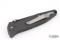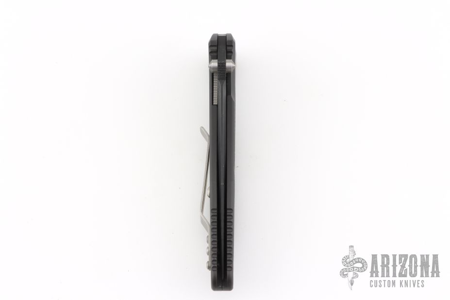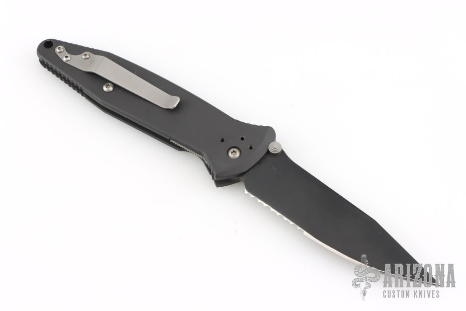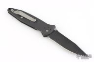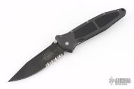 This Socom M/A by Microtech Knives has a black partially serrated blade and a black aluminum frame with a bead blasted stainless steel clip and hardware. Dated 10/98. Has some light scuffs and scratches, great overall condition.