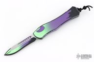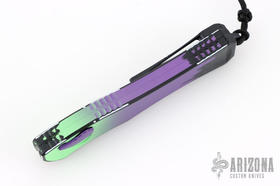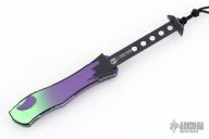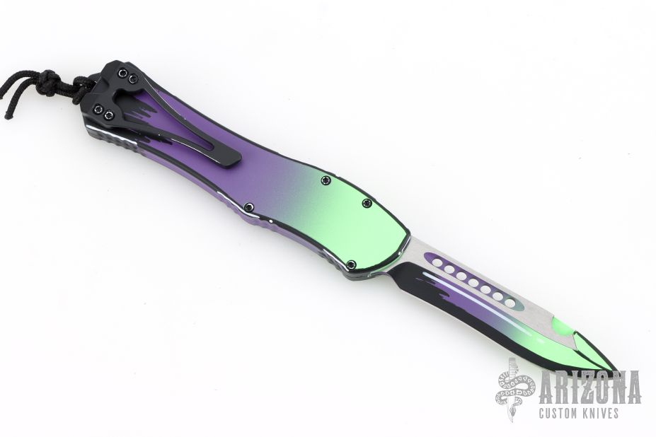 This Hydra by Heretic Knives (Anthony G. Marfione) features a "Frankenstein Monster" finished recurve blade. The handle has a matching "Frankenstein Monster" finished aluminum frame, stainless clip, black charging handle. Comes with original box and lube. S/N 062. New condition.