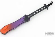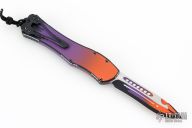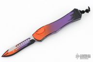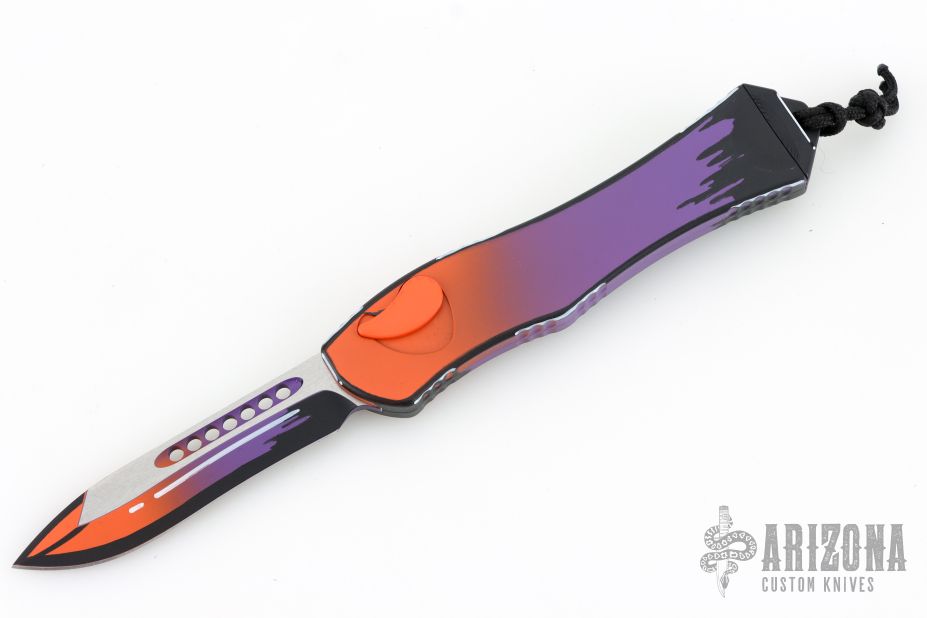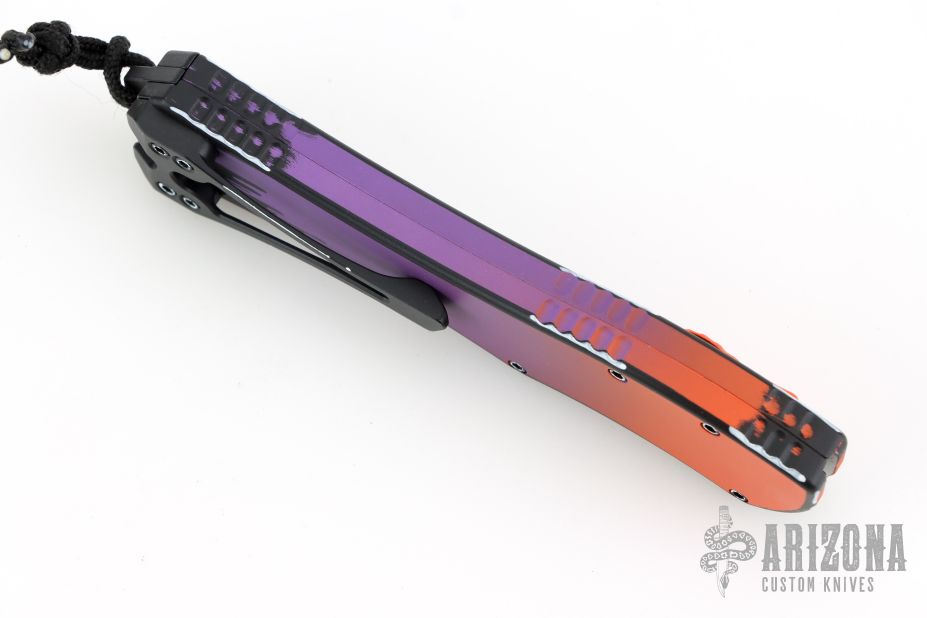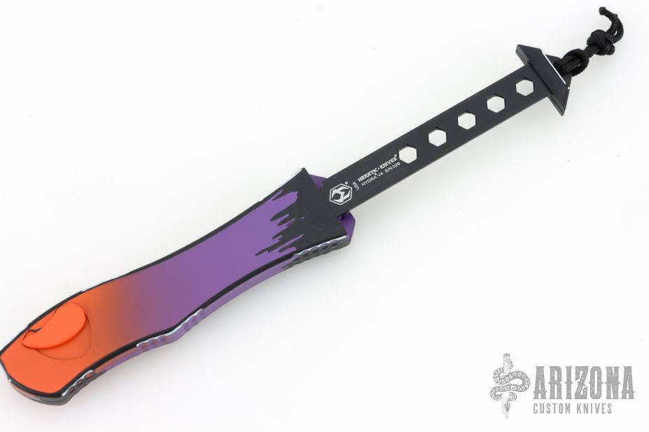 This Hydra by Heretic Knives (Anthony G. Marfione) features a "Horror Nights" finished recurve blade. The handle has a matching "Horror Nights" finished aluminum frame, stainless clip, black charging handle. Comes with original box and lube. S/N 026. New condition.