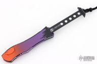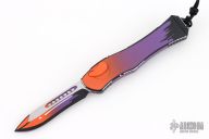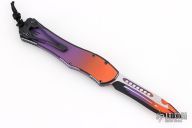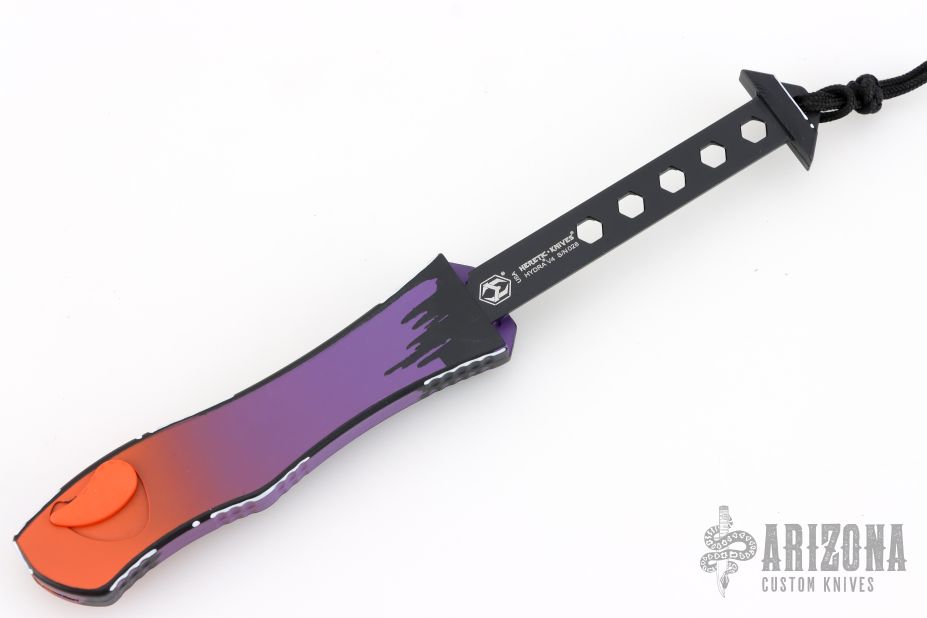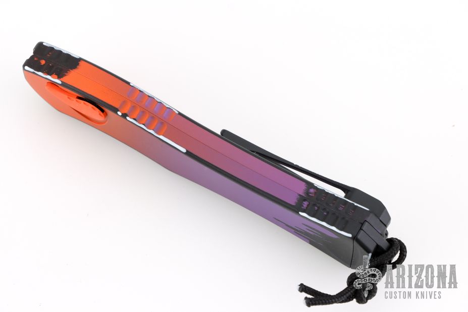 This Hydra by Heretic Knives (Anthony G. Marfione) features a "Horror Nights" finished recurve blade. The handle has a matching "Horror Nights" finished aluminum frame, stainless clip, black charging handle. Comes with original box and lube. S/N 028. New condition.