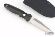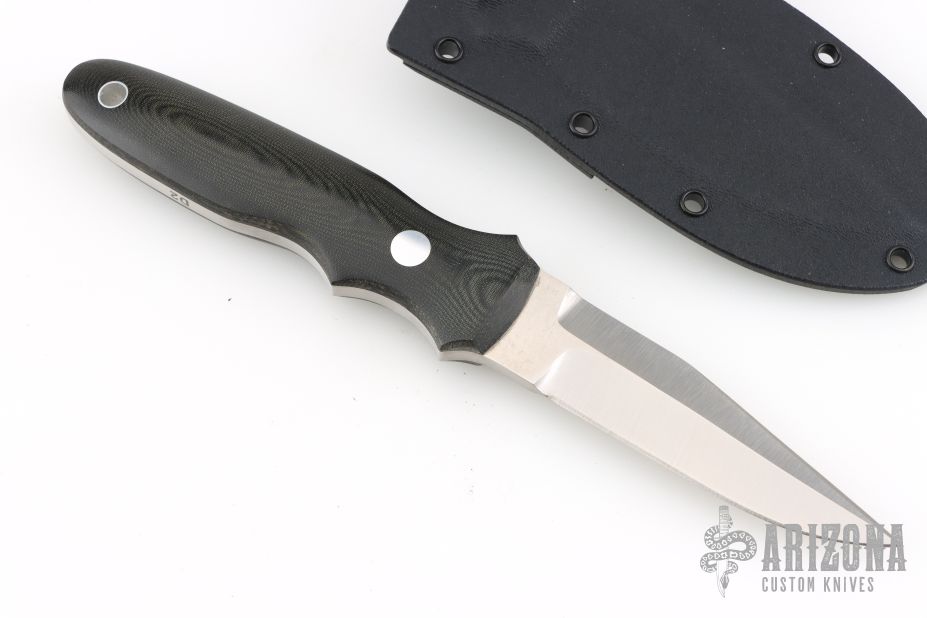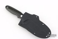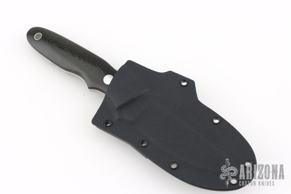This New York Special by Dozier knives features a satin finished blade with top edge, .183" blade stock and .875" blade depth, full tang construction. The handle has black linen micarta scales with brass pins and lanyard hole. Comes with a kydex sheath with belt clip (wrong Dozier sheath, does not fit this knife exactly). Has some light patina, otherwise excellent condition.