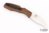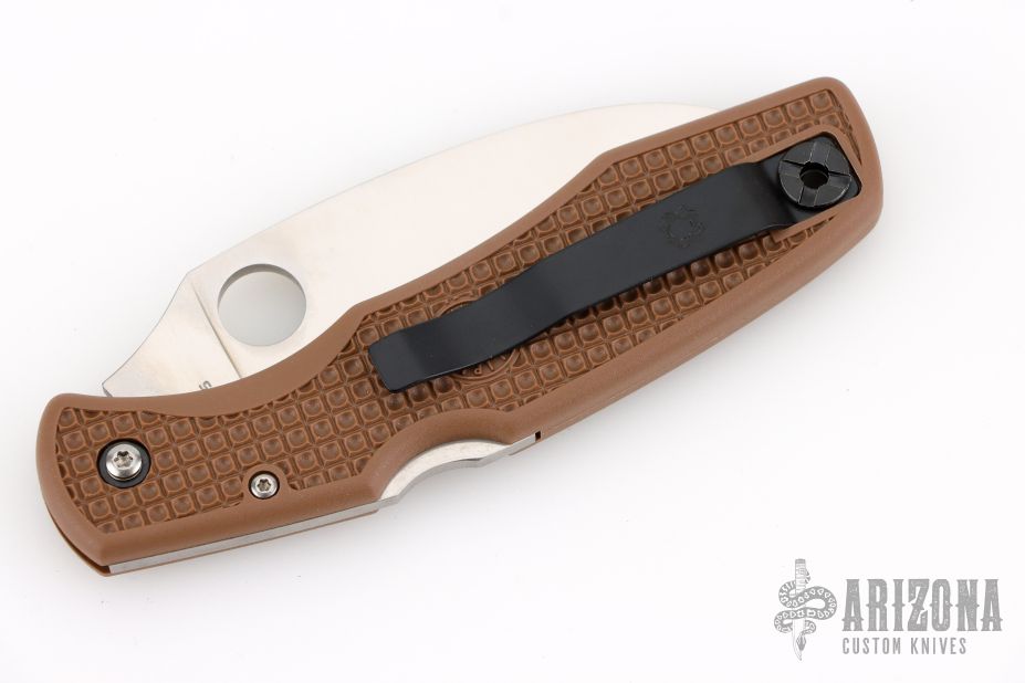 This Matriarch by Spyderco features a satin finish blade with a hawkbill blade made of VG-10 steel. Brown FRN handle for grip, tip up black stainless clip, reversible. New condition. Includes original box and paperwork. 2010 Sprint Run.