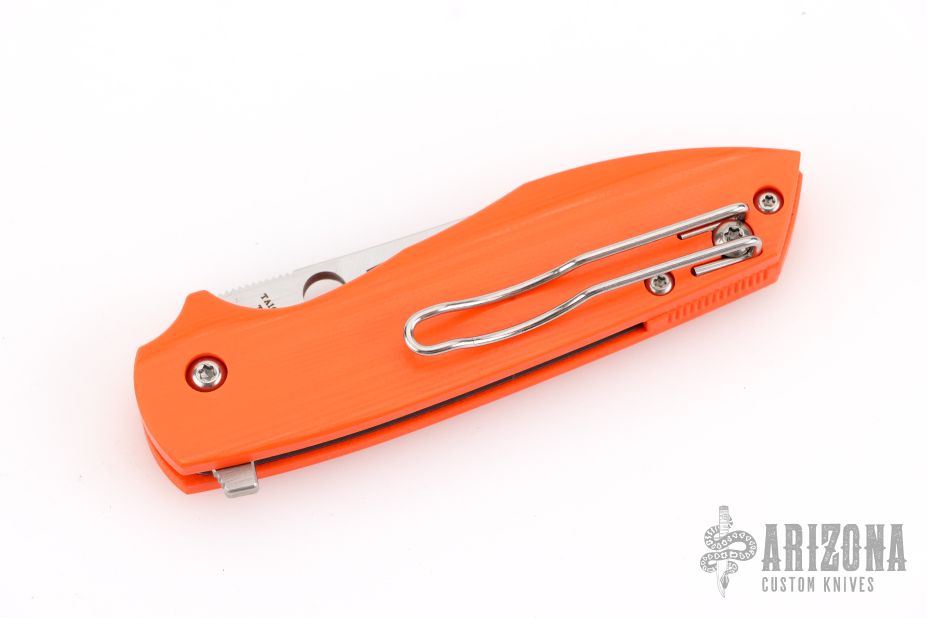 This Positron by Spyderco is a Brad Southard design, it features a satin finished blade with notched thumbrest, thumbhole and flipper. The handle has an orange G-10 frame and backspacer with stainless steel liner and a tip up paper clip style clip, left or right reversible. Comes with original box and papers. New condition. Knife Center Exclusive.
