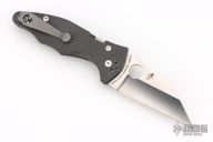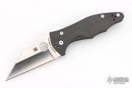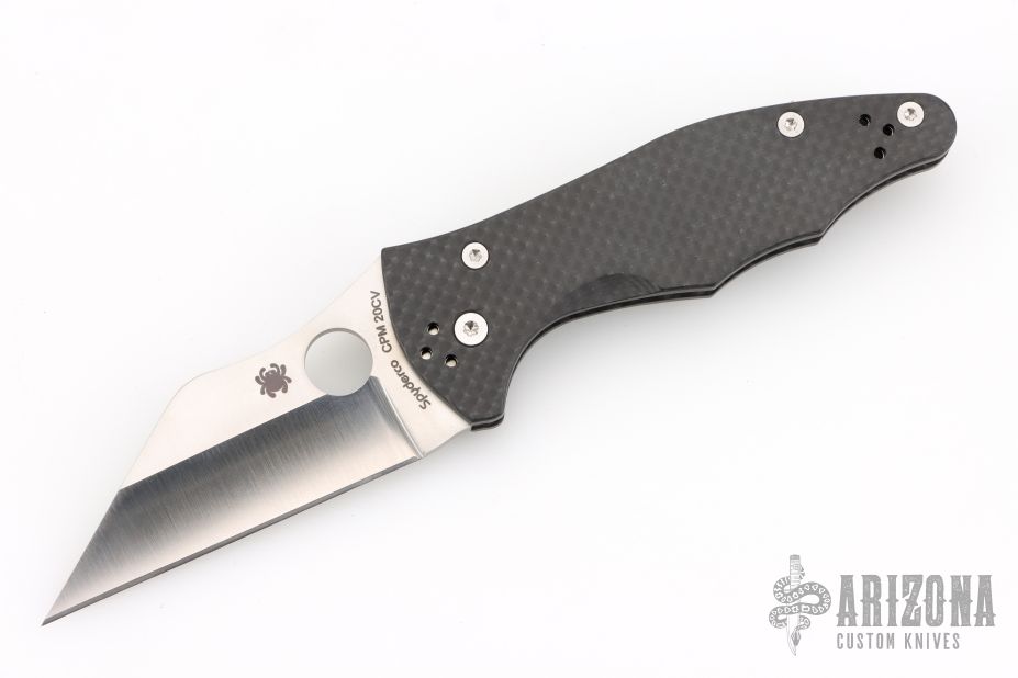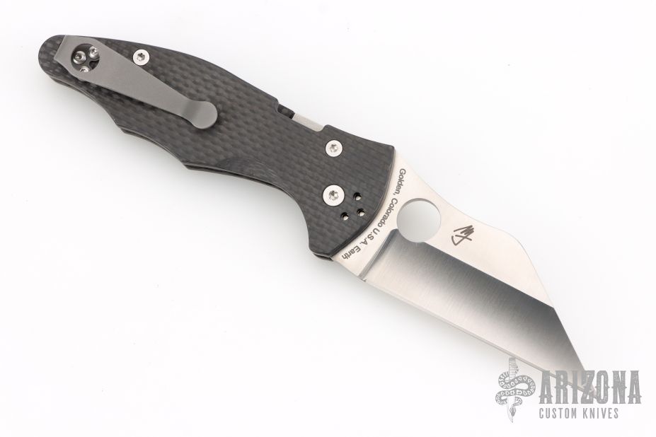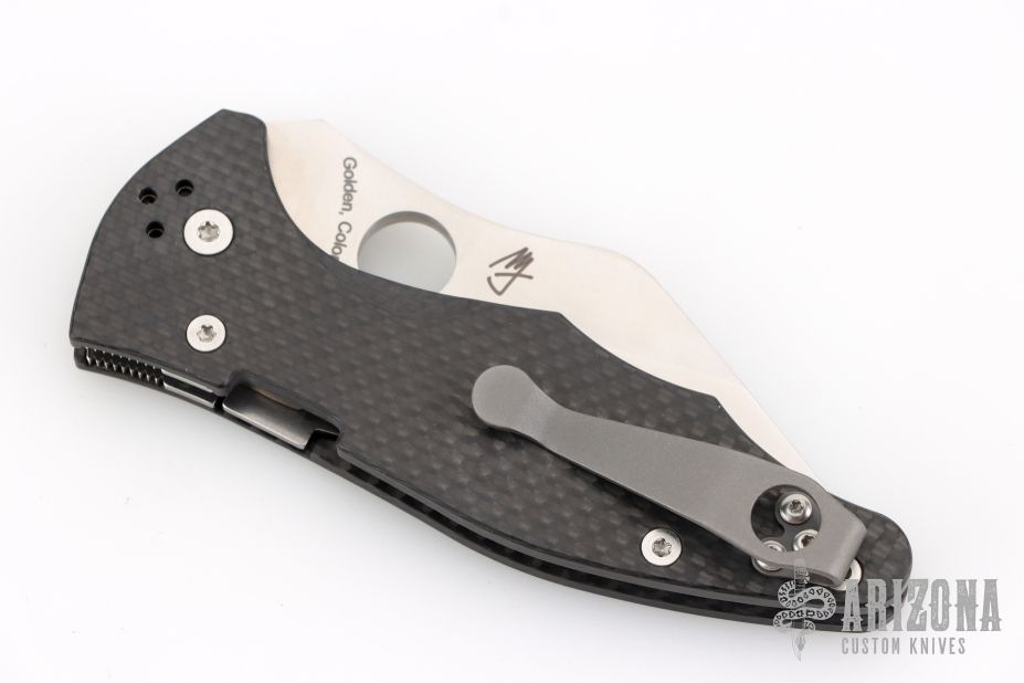 This Yojimbo 2 Linerlock Folder by Spyderco has a satin finished 20CV wharncliffe blade with thumb hole. Handle is carbon fiber with single liner (top-side lock), and 4-way reversible clip. Comes with original box and paperwork. Excellent condition. Has a deep carry titanium clip.