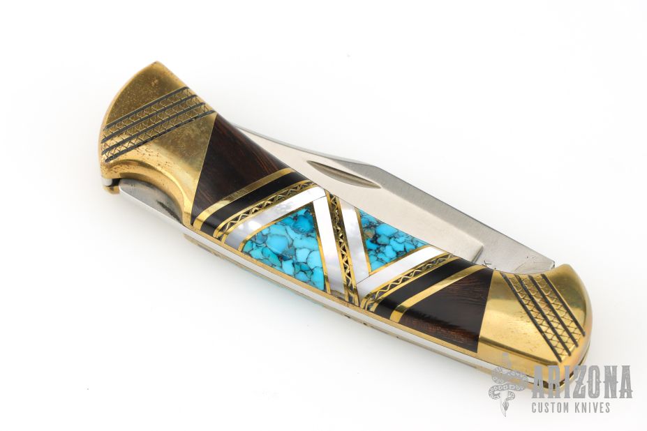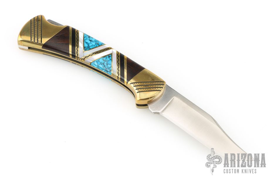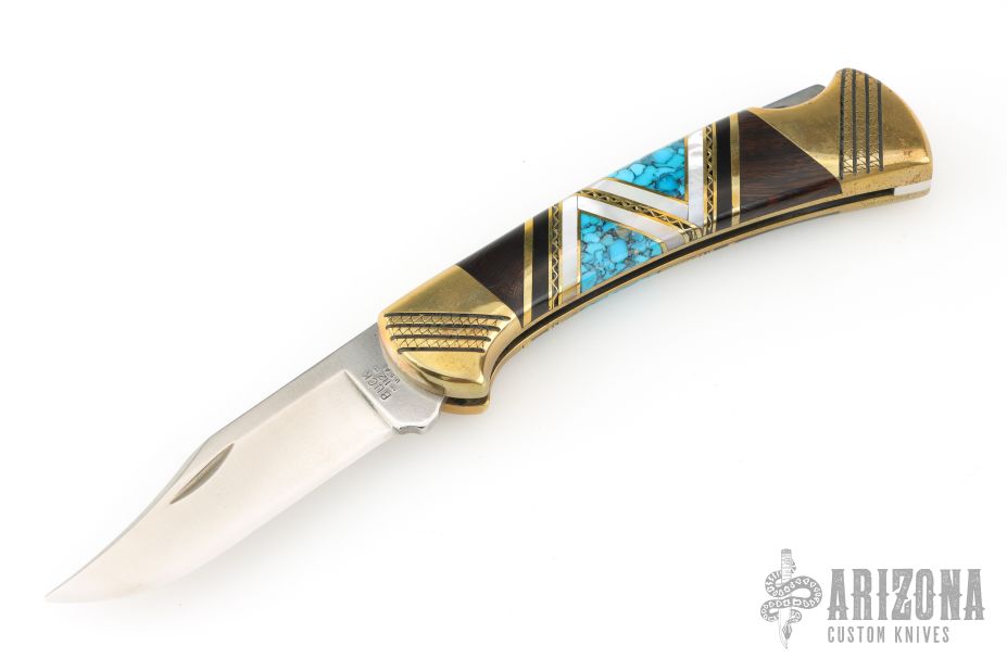 This Buck Model 112 knife Customized by David Yellowhorse is a lock back with brass bolsters with brass inlays. Turquoise, black, wood, and pearl spacers. Mirror polished blade. Strong lock up. Includes a wood display case and small plaque. Excellent condition.