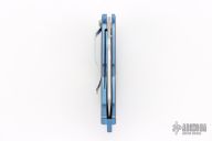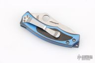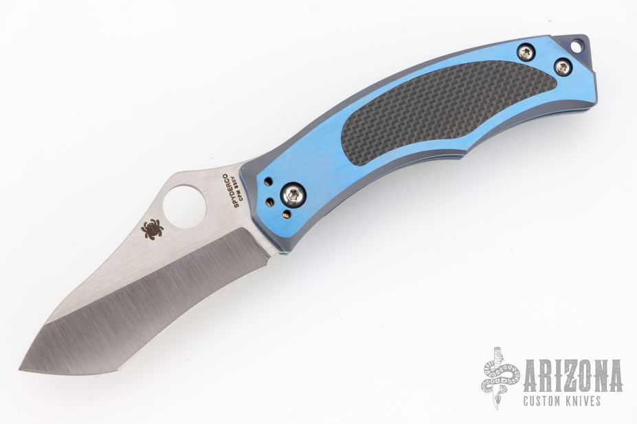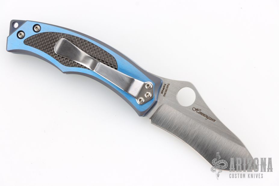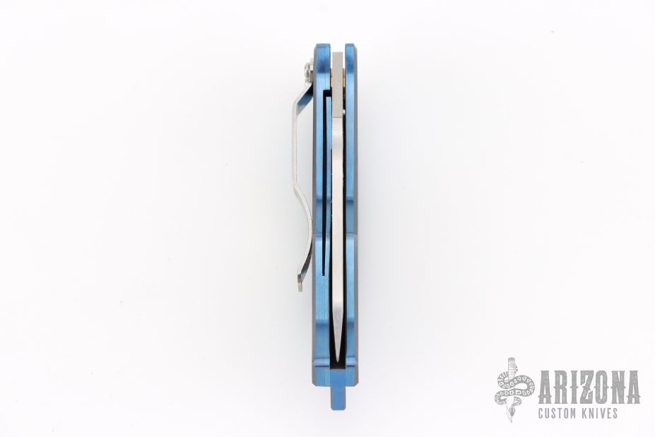 The Vrango’s unique blade is housed in a handle that consists of a full-length backspacer, handle scales, and LinerLock mechanism, all machined from solid titanium and anodized a brilliant blue hue. A two-step finishing process provides contrasting texture between the bead-blasted, radiused edges of the handle and the flawlessly satin-finished surfaces on the flats and handle back. Both sides of the handle are inlaid with handsome carbon fiber inserts and the extended titanium backspacer offers a generous lanyard hole for the easy attachment of fobs and lanyards. A reversible stainless steel clip attaches to either side of the pivot-pin end of the knife to provide convenient, ambidextrous, tip-down carry. An amazing fusion of artistic expression and utilitarian function, the Vrango is as practical as it is beautiful.