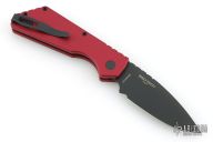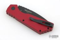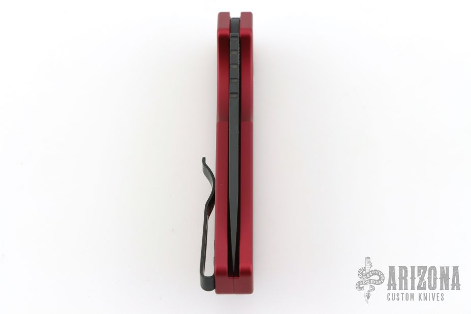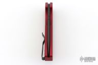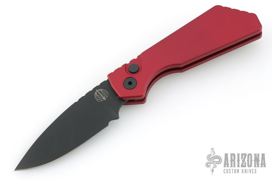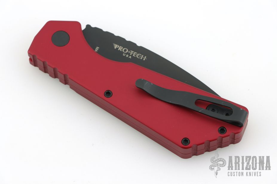 This Pro-Strider PT by Pro-Tech and Strider Knives features a black blade with notched thumbrest. The handle has a red aluminum frame with black hardware and black stainless steel tip up clip.  Black push button. Comes with original box, pouch, and papers. Excellent Condition.