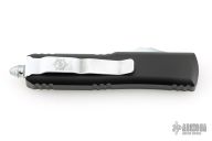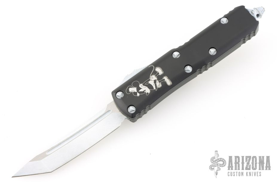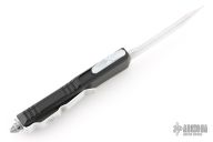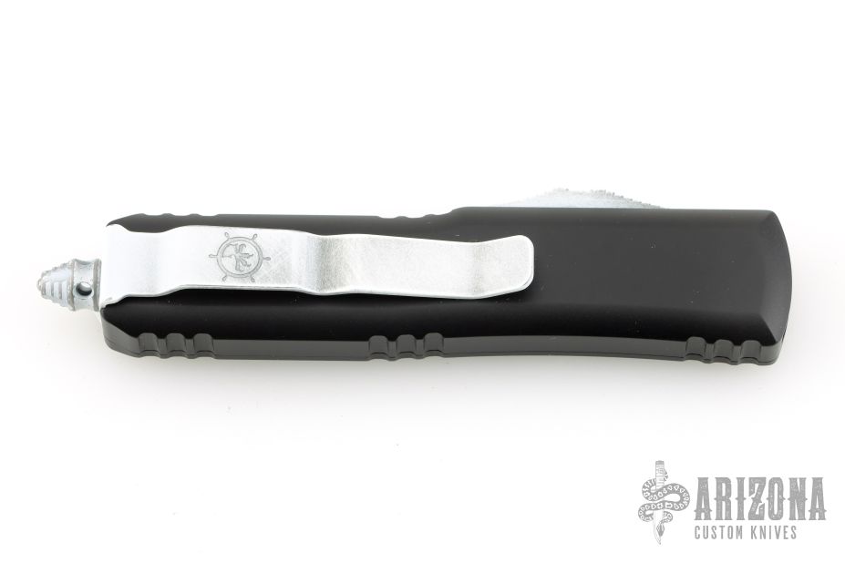 This UTX-85 by Microtech features a two-tone white/satin tanto blade with fullers. The handle has a black aluminum frame with white hardware and tip down clip. Comes with original box and papers. Excellent condition.