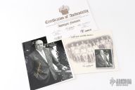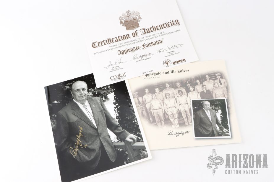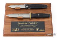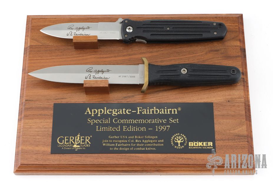 This Applegate-Fairbairn Special Commemorative Set is a Limited Edition made in 1997, and is numbered 2967 of 3000. The set includes a Gerber Covert Combat Folder and a Boker Combat Fighter, both serial numbered 2967 and affixed to a walnut plaque. Set is in Excellent condition. Comes with original box and has a book by Chuck Karwin and a signed picture of Colonel Appegate in a cardboard envelope.