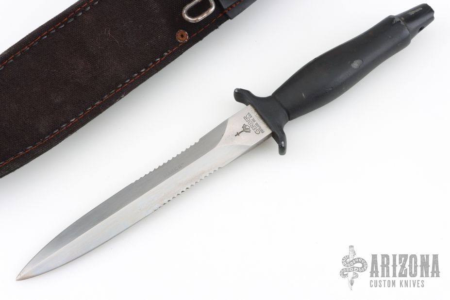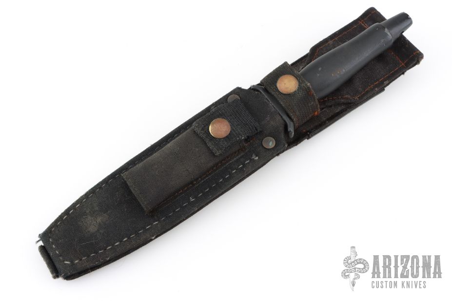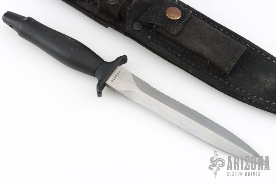 The Mark II is one of the best selling knives of all time. First introduced in 1966, this tactical knife is serialized for collectors. Satin finished double edged partially serrated blade, .253" blade stock and .919" blade depth, hidden tang construction with a black aluminum handle. Comes with a black nylon sheath. Has some scuffs and scratches. Okay condition for its age.