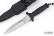 This is a Gerber TAC II Military Survival Knife with the locking sheath. The blade is double edged and double serrated. Blade is .149" thick and 1.135" in depth. Blackie Collins is the designer. The handles on TAC IIs are molded Zytel, full-hidden-tang. Comes with original locking sheath. Serial #A098332. Excellent Condition.
