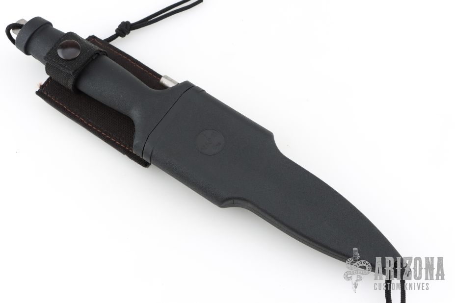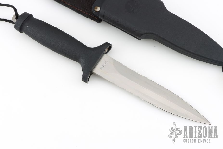 This is a Gerber TAC II Military Survival Knife with the locking sheath. The blade is double edged and double serrated. Blade is .149" thick and 1.135" in depth. Blackie Collins is the designer. The handles on TAC IIs are molded Zytel, full-hidden-tang. Comes with original locking sheath. Serial #A098332. Excellent Condition.