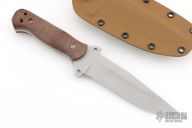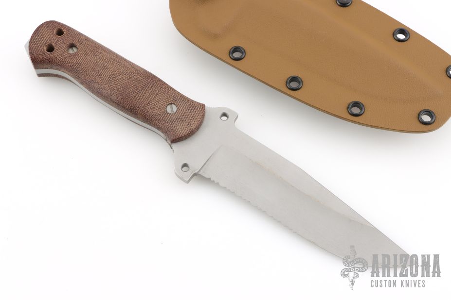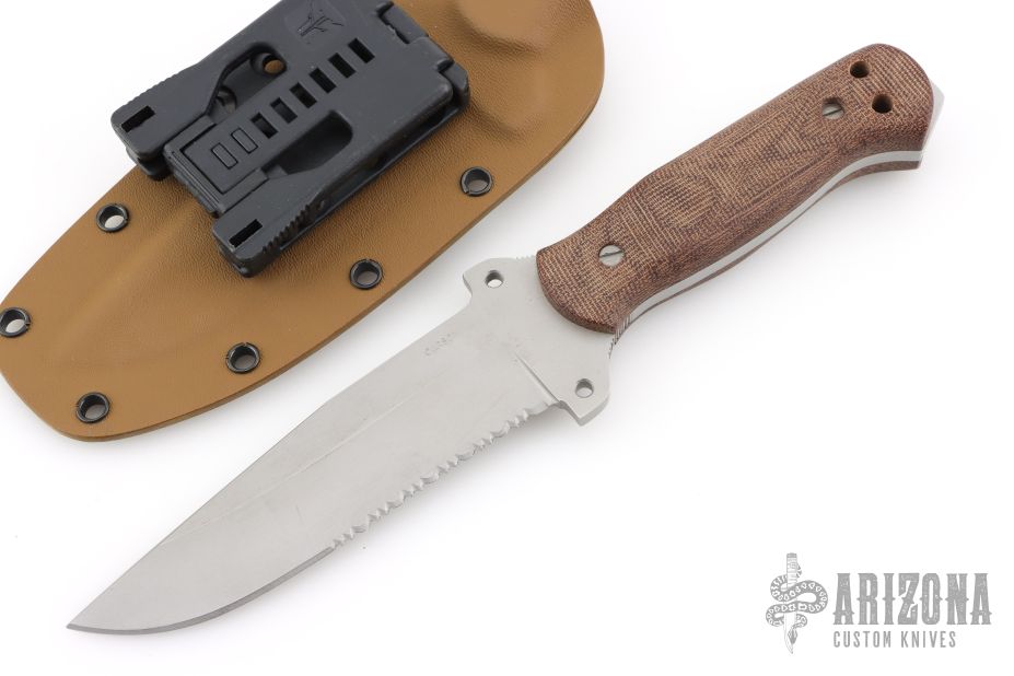 This Prototype Combat Knife by Kit Carson features a bead blasted blade with partially serrated edge, .197" blade stock and 1.330" blade depth, full tang construction. The handle has green canvas micarta scales. Comes with a kydex sheath with TekLok. Has some light scuffs, otherwise excellent condition. Marked "PROTOTYPE" on the blade spine.