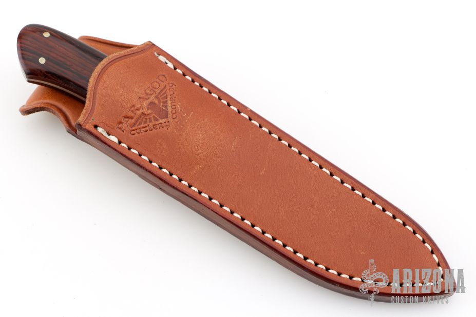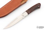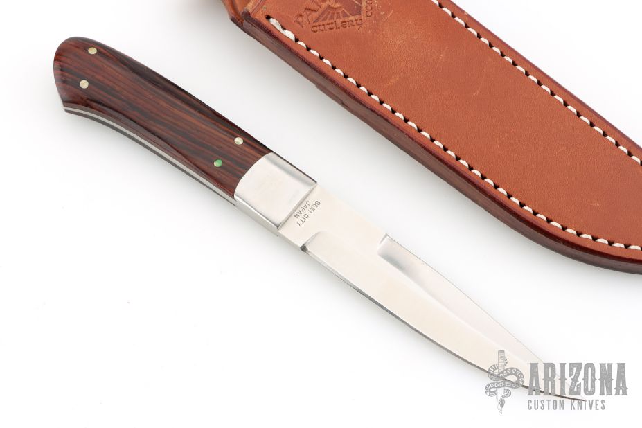 This Tommy Lee Boot Knife by Paragon Cutlery features a satin finished blade with false top edge, .125" blade stock and .813" blade depth, full tapered tang construction. The handle has stainless dovetailed bolsters, cocobolo scales. Comes with brown leather sheath with belt loop. Has some light scratches, otherwise excellent condition.