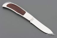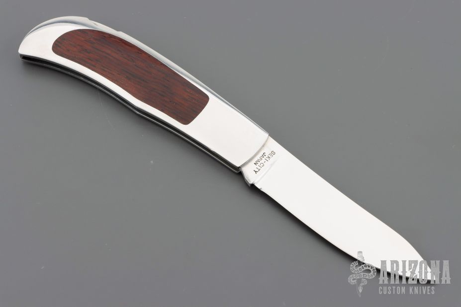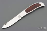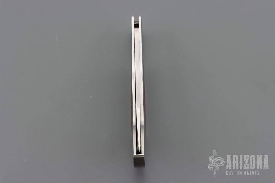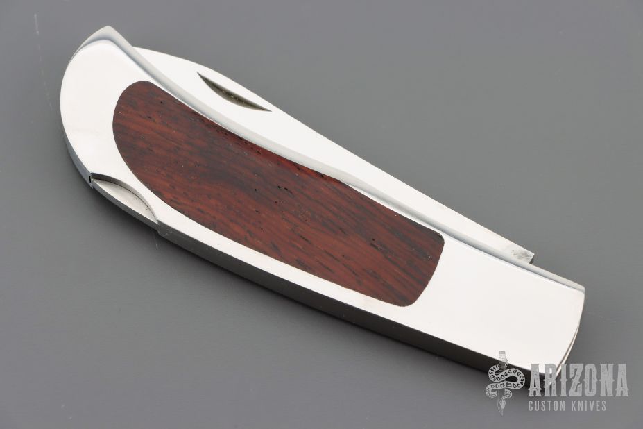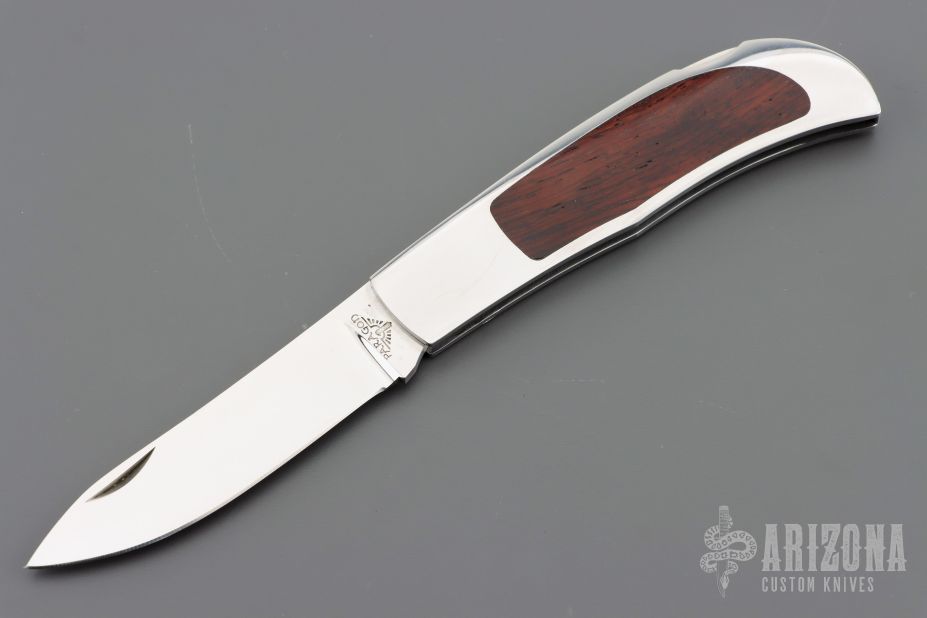 This Herron Design Interframe Lockback by Paragon features a mirror polished blade with nail nick. The handle has a mirror polished stainless steel frame with cocobolo inlays, stainless steel backspacer. Has a few light scratches, otherwise excellent condition.