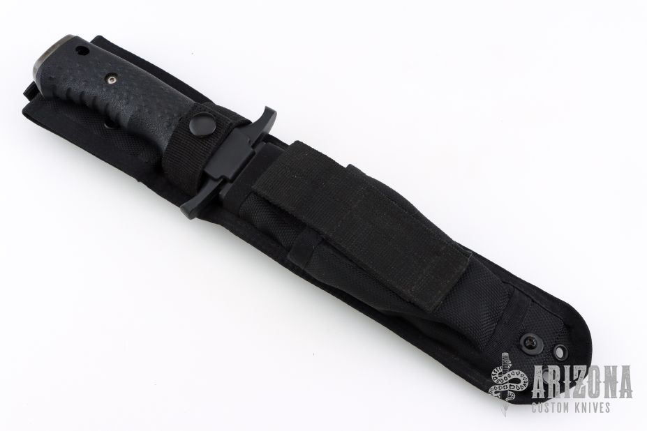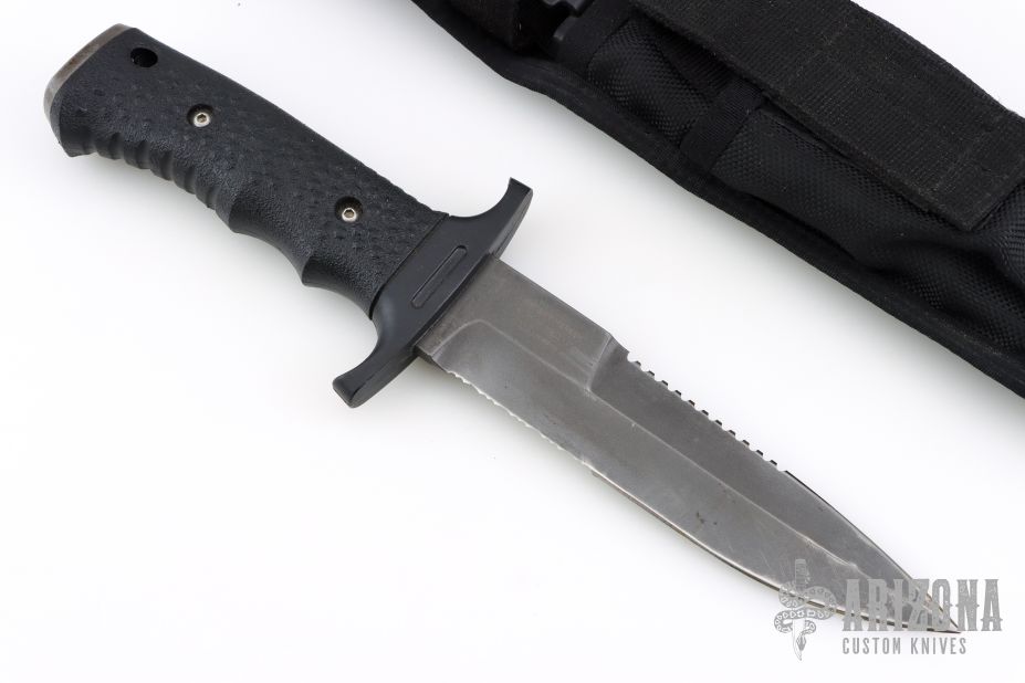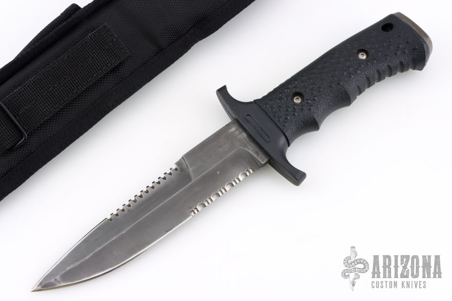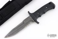 "The Silver Trident is more than a symbol of America's top Special Ops personnel. It's living proof that guys who handle our nation's nastier chores will go through whatever kind of hell is necessary, so long as they have the best gear. The Silver Trident has the most technically advanced handle ever engineered on a combat knife. It's resistant to heat, UV light and chemicals. The brainchild of William Harsey, Jr. and Chief Watson - a founding member of Navy Seal Team 2 - the handle is a co-mold of two versions of the material called Hytrel. Inside, there's a rock-hard version for strength. Outside, there's the soft, textured version for extreme grip control. Use the stainless steel pommel as a hammer. The double-edged clip point blade is 154C stainless steel, heat-treated to achieve a hardness rating of HRC 59-61. That means you get excellent edge retention, strength and flexibility. The non-reflective black blade limits glare and corrosion." Black coated partially serrated double edged blade. 1/4" blade stock and 1 1/4" blade depth, hidden tang construction. Handle is black composite with stainless steel butt cap.