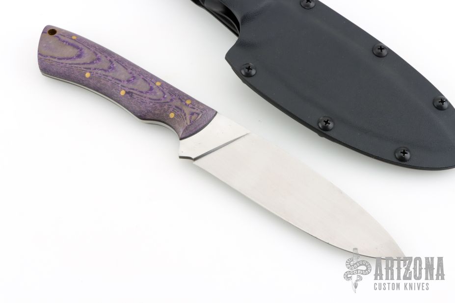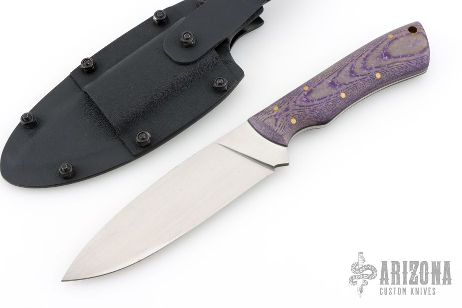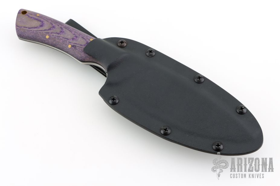 This Camp Knife by Samuel Riner features a hand rub satin finished blade with .178" blade stock and 1.464" blade depth, full tapered tang construction. The handle has purple linen micarta with flower motif in the fabric, brass pins and black micarta liners, lanyard hole at the butt. Comes with a Kydex sheath with leather loop. Has a couple very light scratches, otherwise excellent condition.