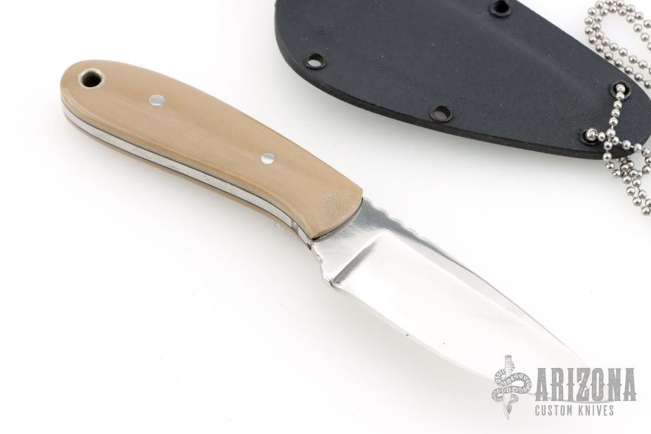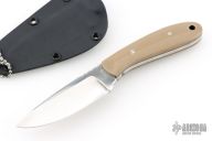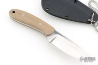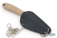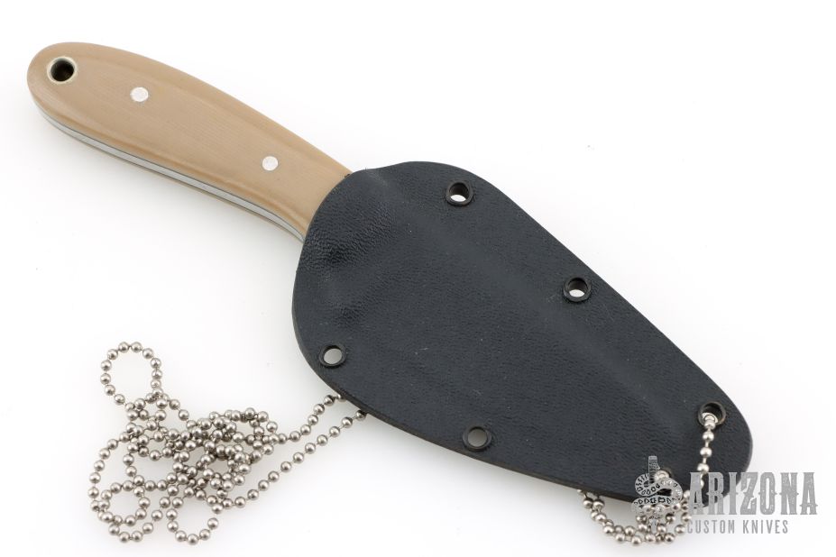 This EDC by Kim Breed features a satin finished blade with notched thumbrest, .146" blade stock and .995" blade depth, full tang construction with brown G-10 scales and black liners. Comes with a kydex sheath. Has some light scratches, otherwise good condition.