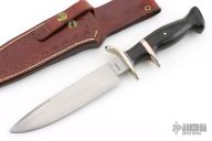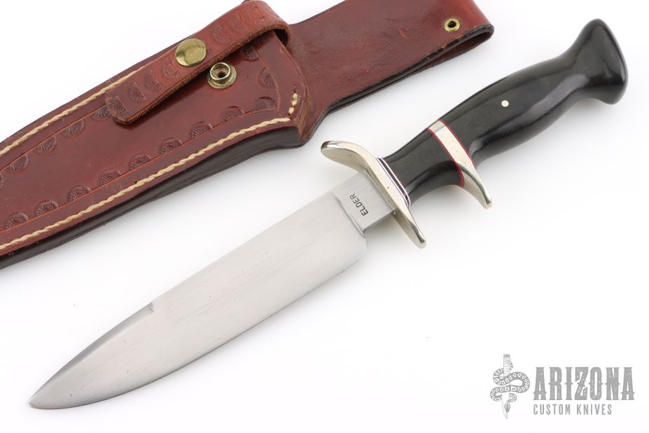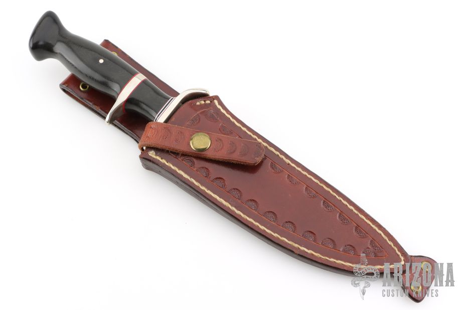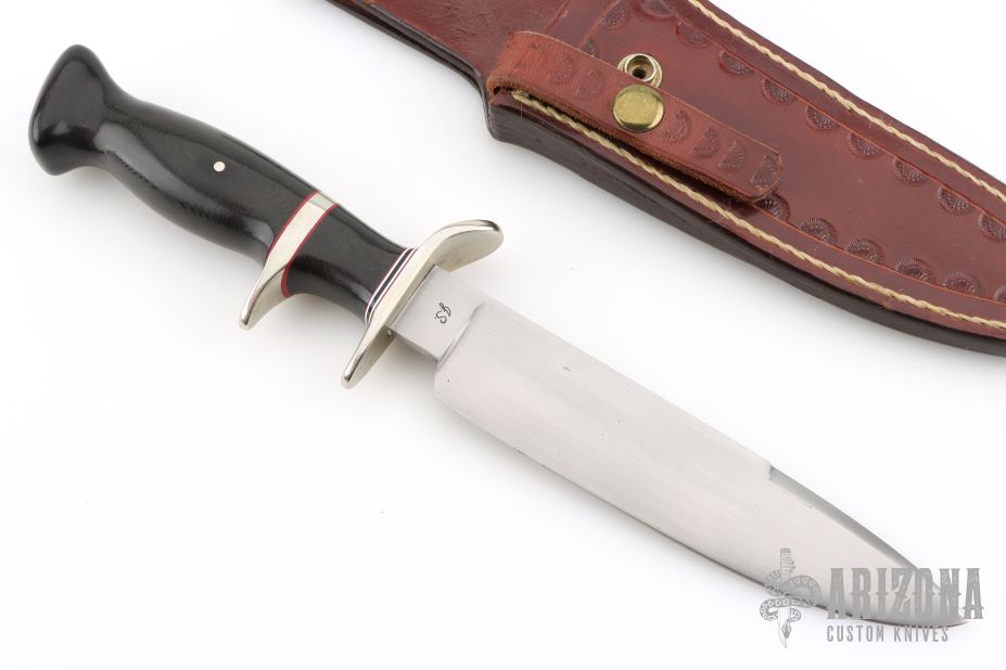 This Sub-hilt Fighter by Journeyman Smith Perry Elder features a hand rub satin finished blade with visible hamon and false top edge, .216" blade stock and 1.390" blade depth, hidden tang construction. The handle has a nickel silver guard and sub-hilt, black linen micarta grip with red/white/black spacers, nickel silver pin. Comes with a hand tooled brown leather sheath. Has a couple light scratches, a couple light oxidation spots, otherwise good condition.