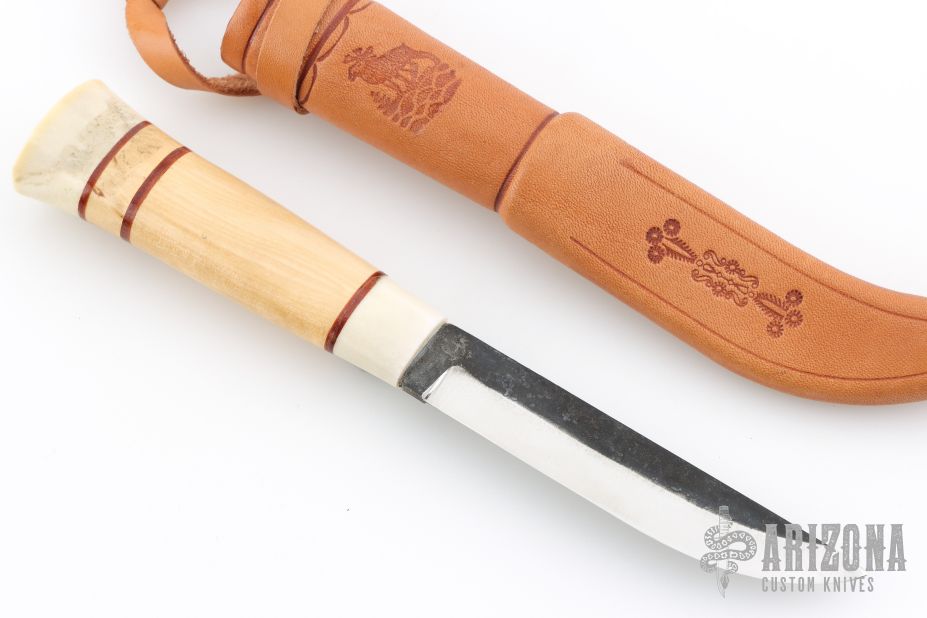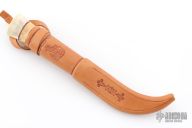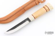 This Pukko features a scandi ground straight point blade with forge finished flats, .126" blade stock and .787" blade depth, hidden tang construction. The handle is made from bone and olivewood with leather spacers. Includes leather sheath with loop. Excellent condition.