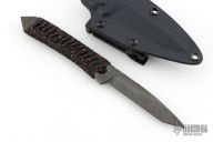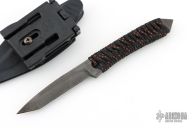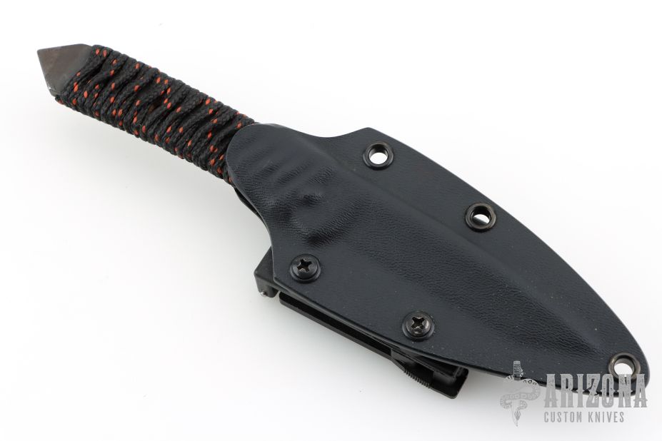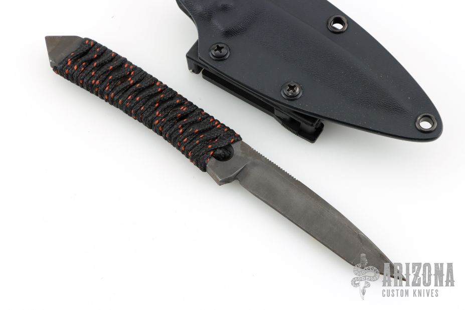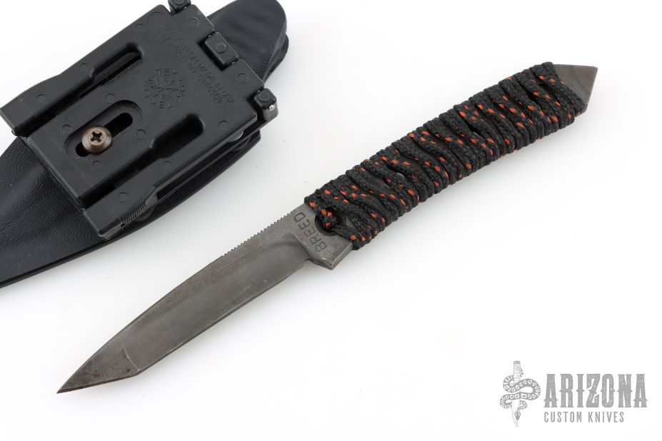 This knife by Kim Breed features a black tanto blade with notched thumbrest, .249" blade stock and .699" blade depth, full tang construction with cord wrap. Comes with a kydex sheath. Has some scuffs on the finish, otherwise good condition.