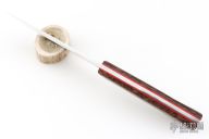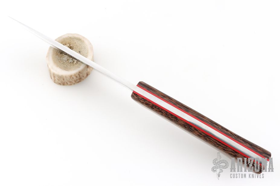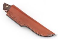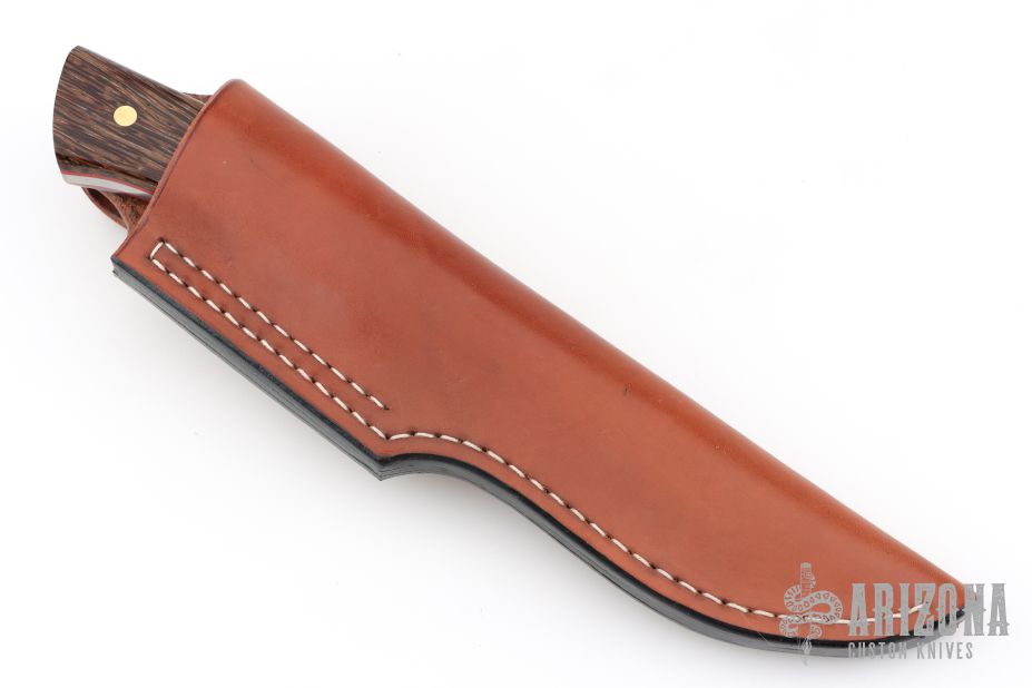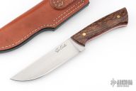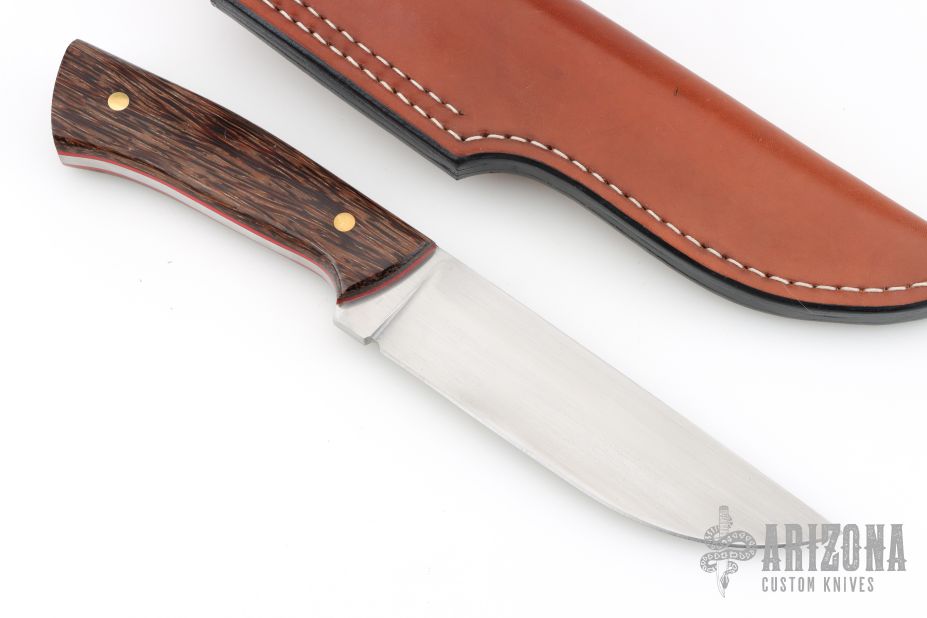 This knife by Steve Candler features a hand rub satin finished blade with .192" blade stock and 1.451" blade depth, full tang construction. The handle has black palmwood scales with red liners and brass pins. Comes with a brown leather sheath. Has a couple light scratches, otherwise excellent condition.