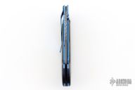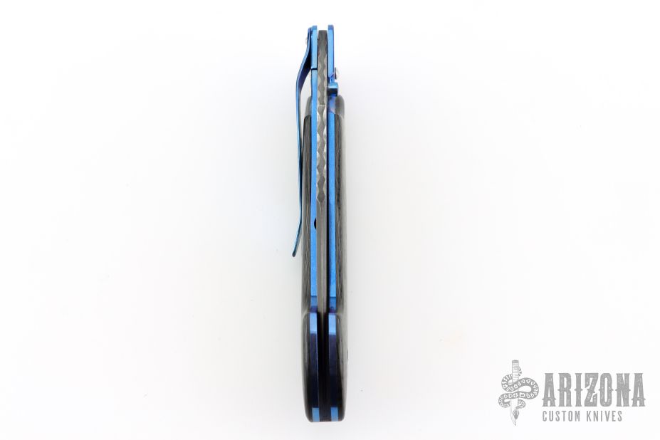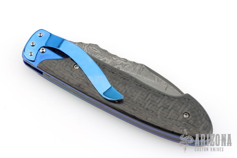 This linerlock folder by Mike Sanders features a Damascus blade with a single thumbstud and fileworked spine. The handle has carbon fiber scales, anodized titanium liners, anodized titanium tip down clip, G-10 backspacer. Comes with a zippered case. Has some light scratches, otherwise excellent condition.  #1150