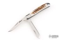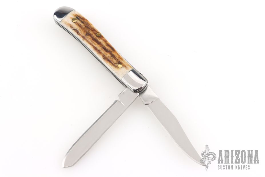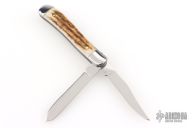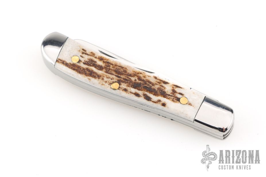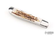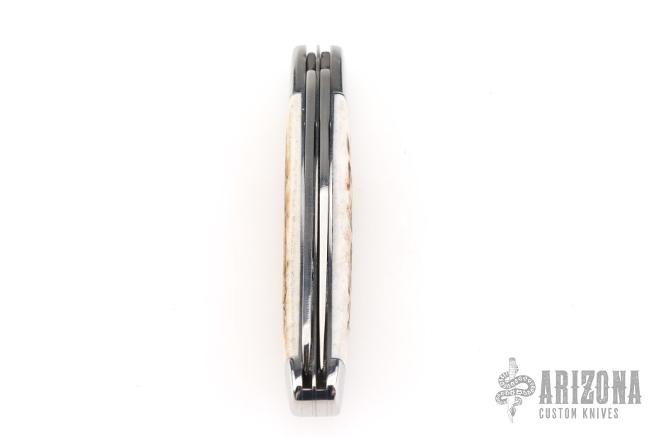 This slipjoint by "Horran" (written in cursive, i think it says Horran, let us know if you know who this is) features two mirror polished blades with nail nicks. The handle has stainless steel bolsters, liners and springs, stag covers with brass pins. Has a few light scratches, otherwise excellent condition.