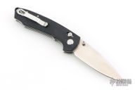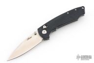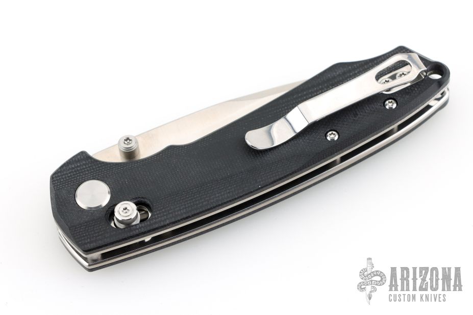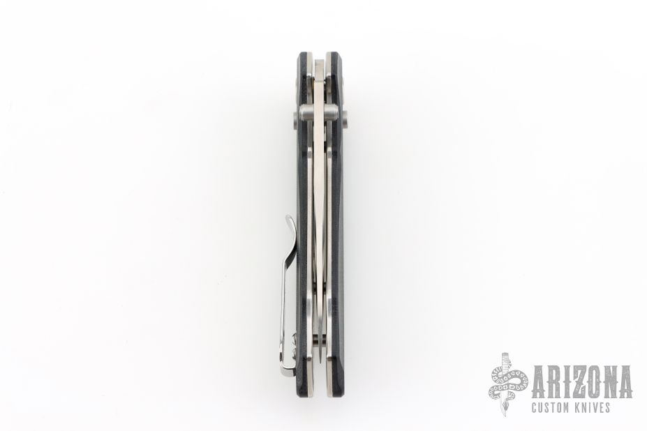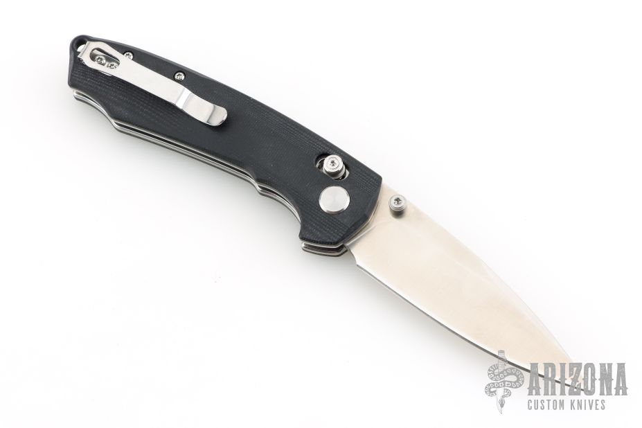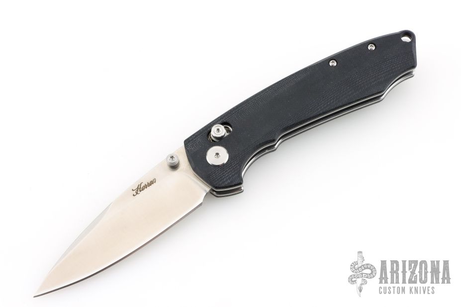 This Axis-Lock Folder by "Horran" (written in cursive, i think it says Horran, let us know if you know who this is) features a satin finished blade with dual thumbstud. The handle has black G-10 scales, liners and tip up clip. Excellent condition.