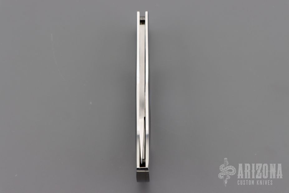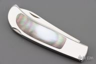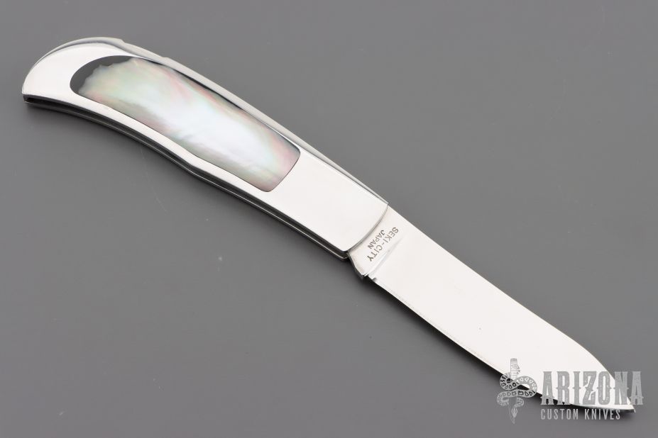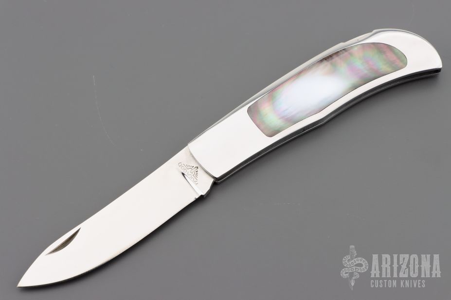 This Herron Design Interframe Lockback by Paragon features a mirror polished blade with nail nick. The handle has a mirror polished stainless steel frame with black lip pearl inlays, stainless steel backspacer. Has a few light scratches, otherwise excellent condition.