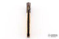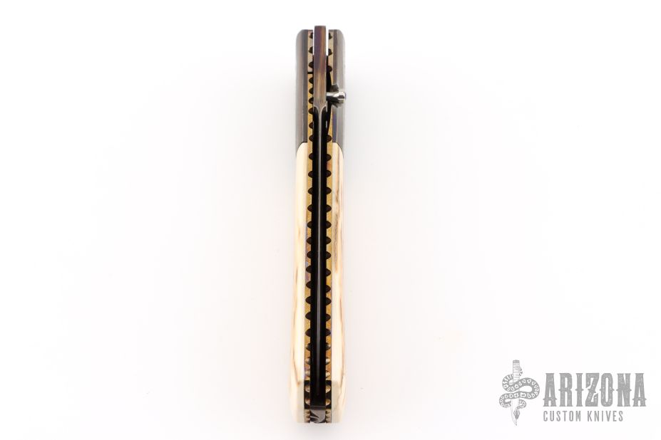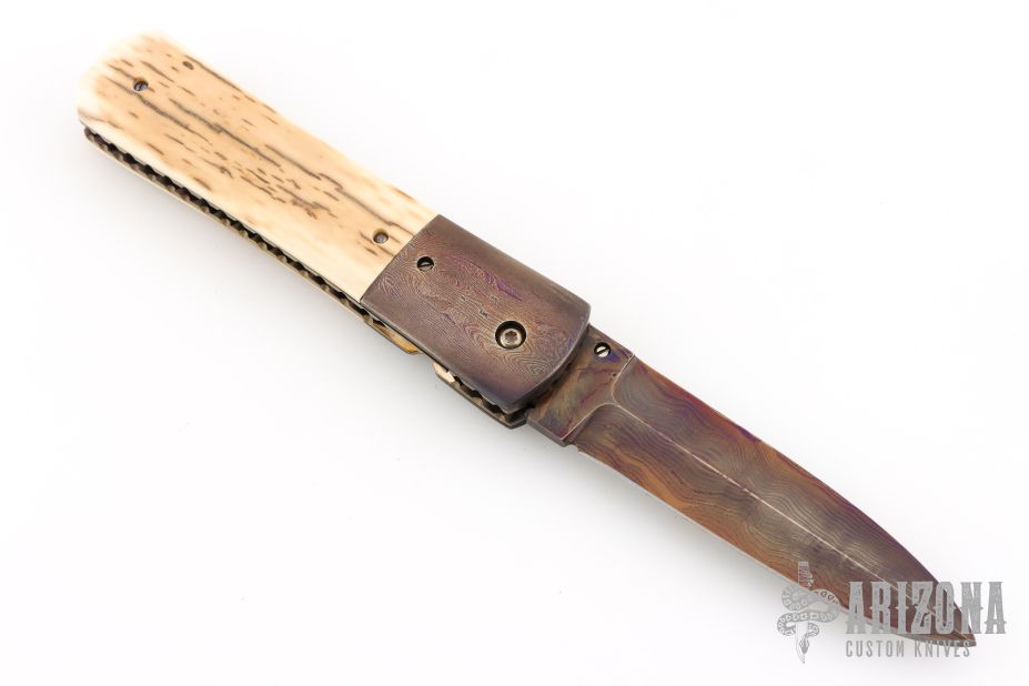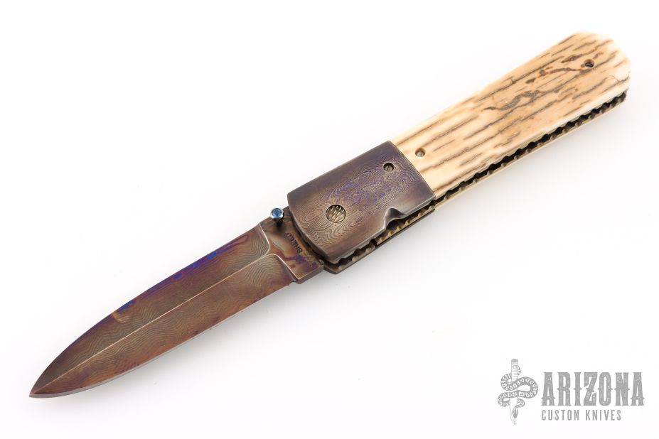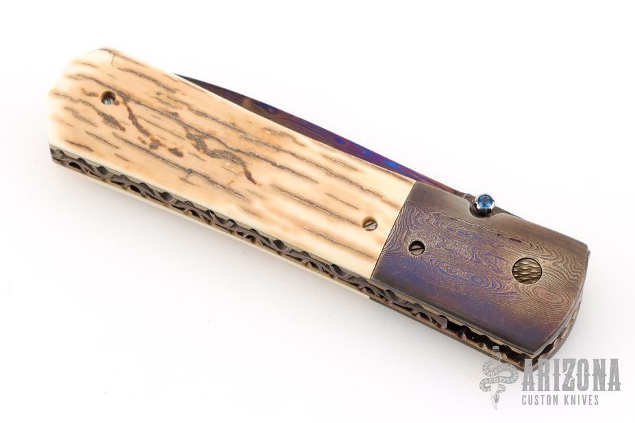 This knife by Kim Breed features a spear point Damascus blade with a false top edge, single thumbstud with a synthetic sapphire inlay. The handle has Damascus bolsters, mammoth ivory scales, fileworked and anodized titanium liners, fileworked Damascus backspacer. Nice blade seating, lockup and detent. Comes with a zippered case. Excellent condition.