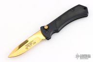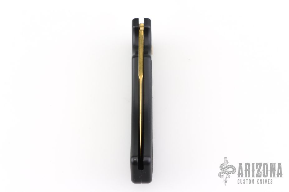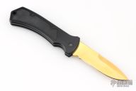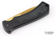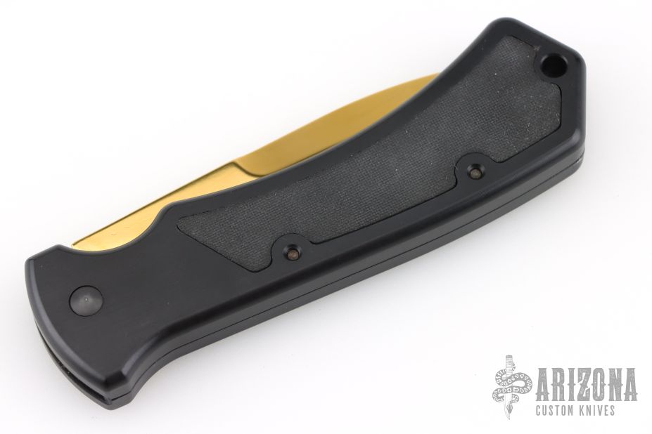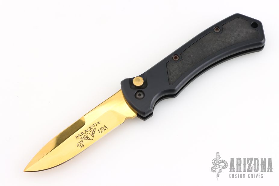 This ATKO II Auto by Paragon with a gold finished blade with false top edge. The handle has a black anodized aluminum frame with non-slip inlays and gold finished button. These are VERY HARD to find! Excellent condition.