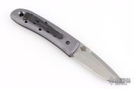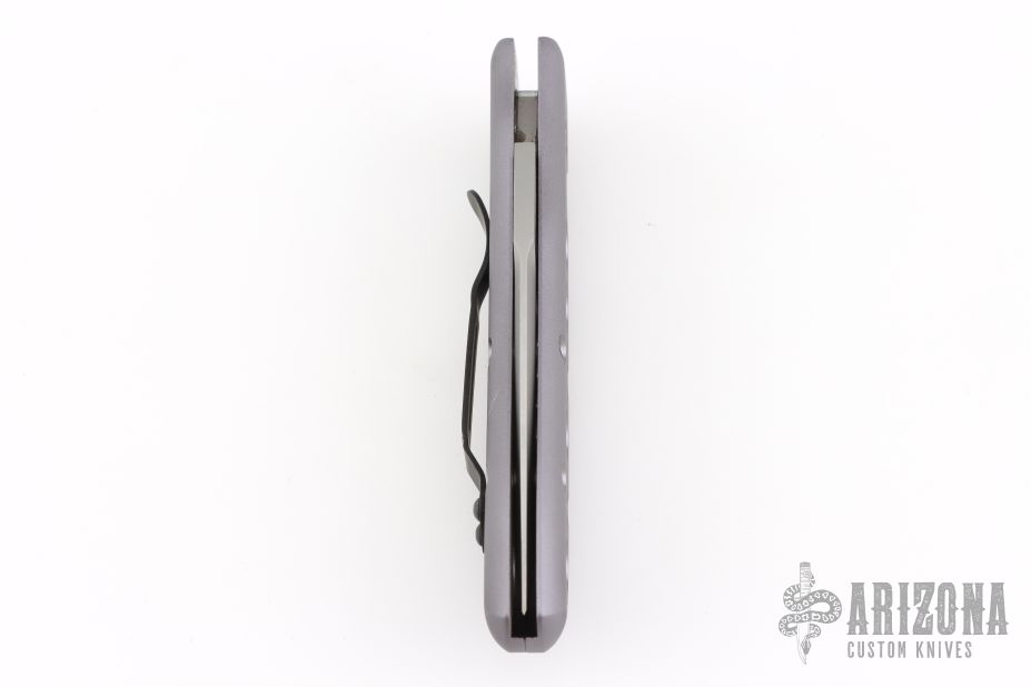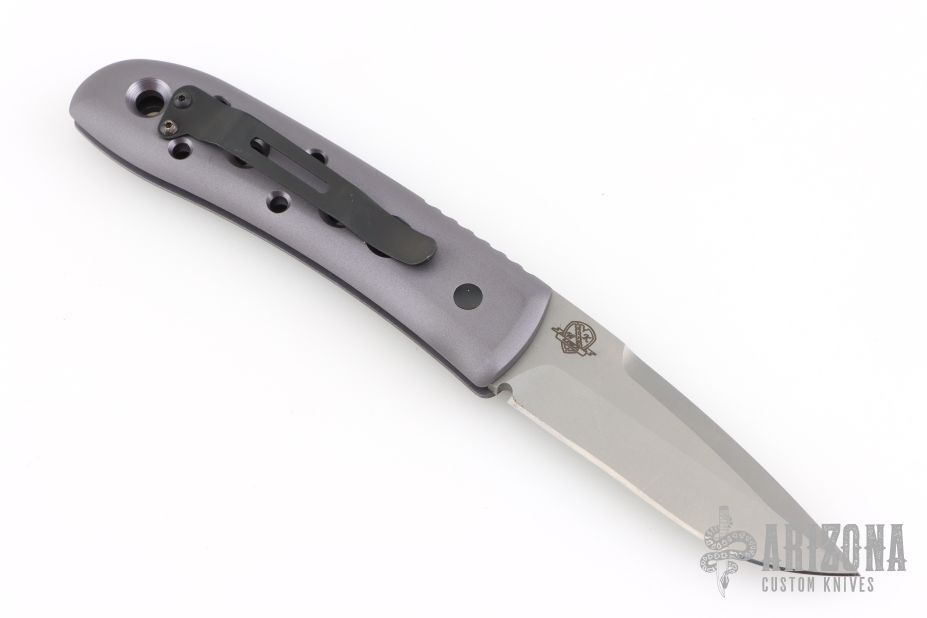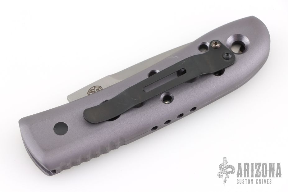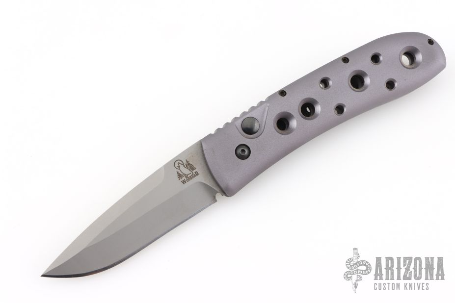 This is a Woodard Knives Fer De Lance side opening automatic with a bead blasted blade and anodized aluminum frame. Stainless steel clip, tip up carry. Has some light scuffs, otherwise excellent condition.