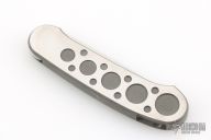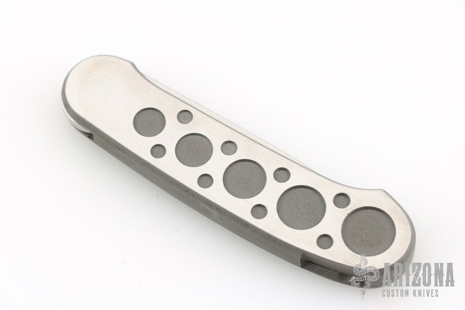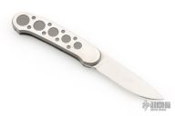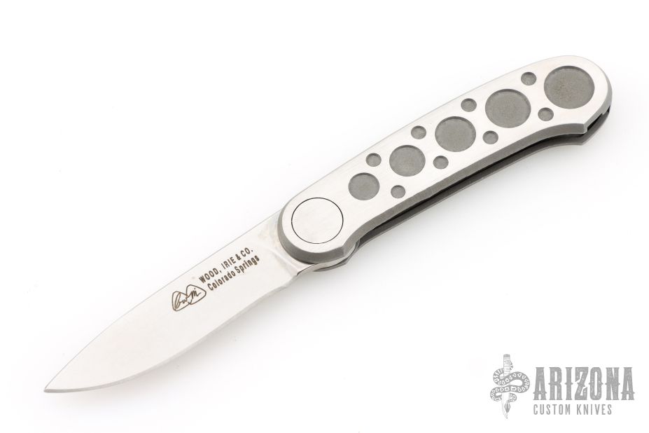 This knife by Mike Irie and Barry Wood polished blade with a two-tone stainless steel handle. Opens and closes like any other swing lock folder. Has some light scratches, otherwise excellent condition. Dated 3-97 inside the frame.