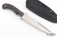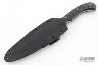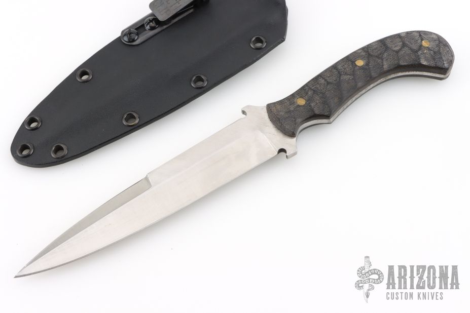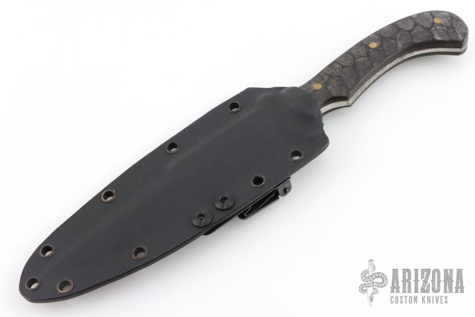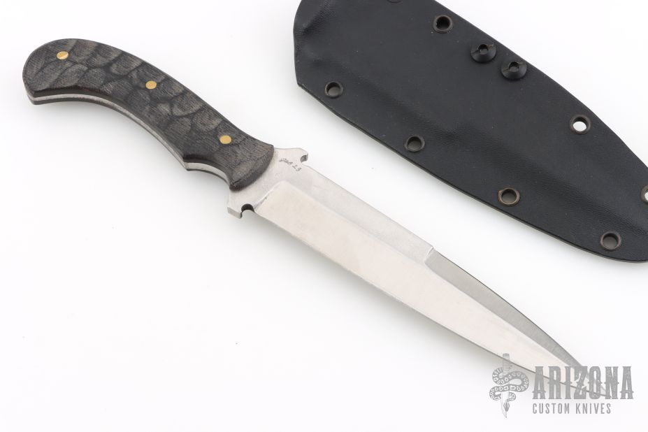 This fighter is marked "JAB 23" on the blade, I think that is what it says. The blade is satin finished with sharpened top edge, .194" blade stock and 1.182" blade depth, full tapered tang construction. The handle has textured canvas micarta scales with brass pins. Comes with a Kydex sheath with an Ulti-Clip. Has scratches, otherwise good condition.
