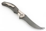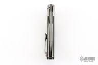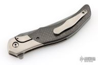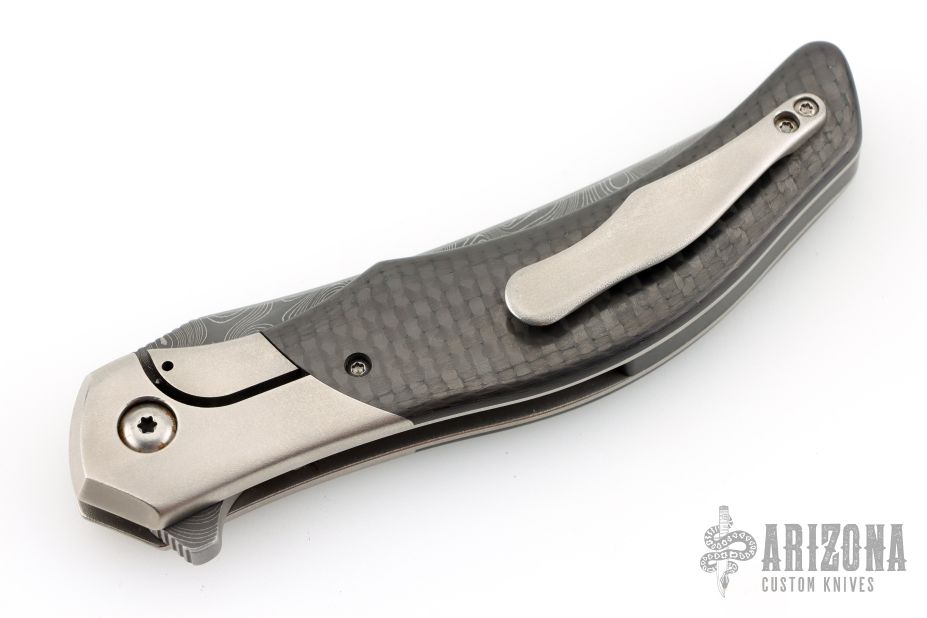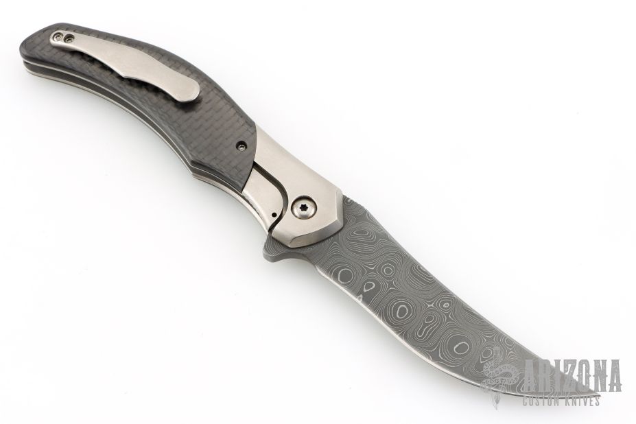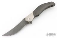 This Mini Persian by Gerry McGinnis features a Chad Nichols SS Damascus blade with notched thumbrest and flipper. The handle has orange peel finished titanium bolsters with integral liners, carbon fiber scales, orange peel finished titanium tip up clip, carbon fiber backspacer. Nice detent, lockup and blade seating. Dated 1-19-16 and #010. Excellent condition.