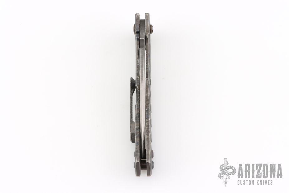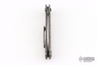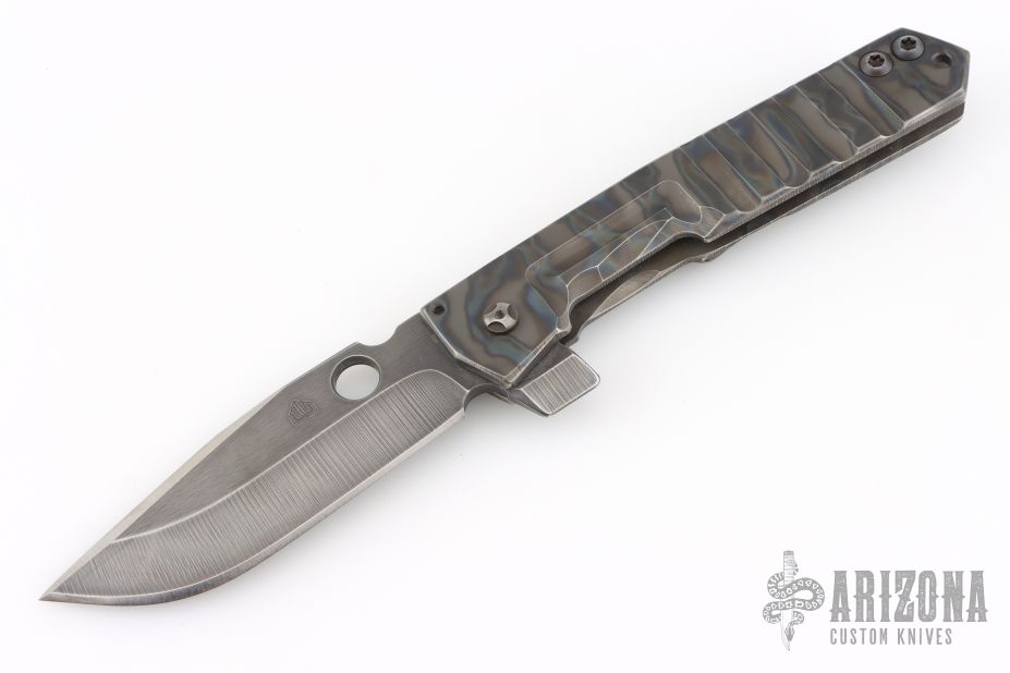 This FIFP Excaliber framelock flipper is the monster version of the popular FIFP. This one features a phantom finish blade and milled titanium frame with a flamed finish and a matching titanium clip. Smooth action. Nice lockup, detent, and seating. Very nice work. Has a few light scuffs, otherwise excellent condition.