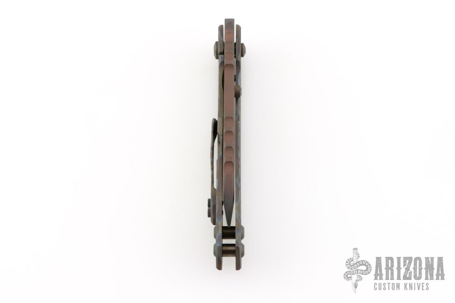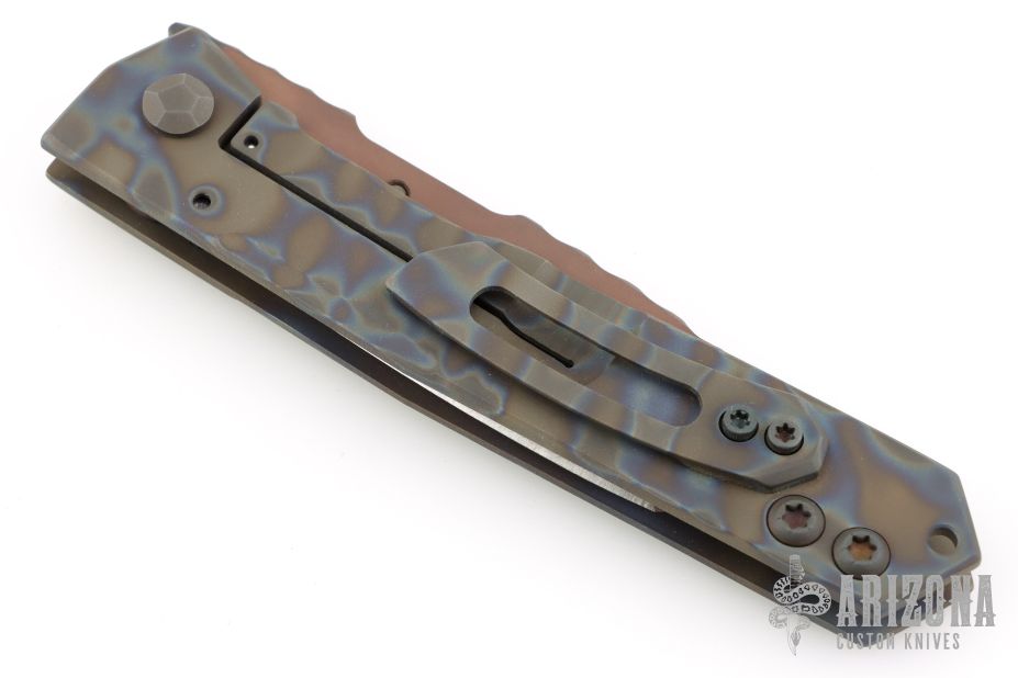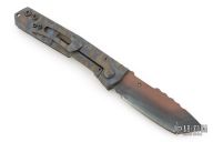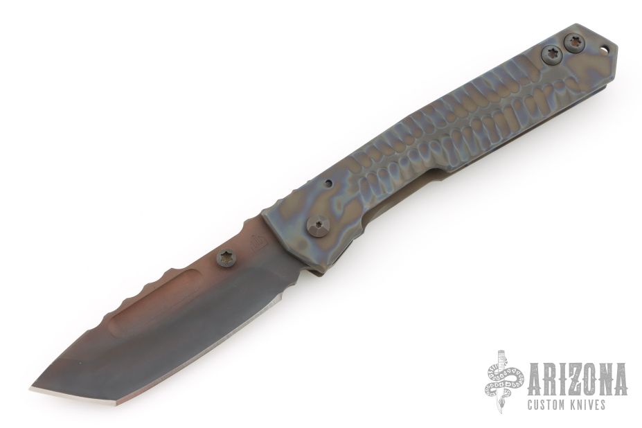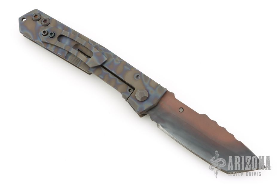 This FIFP Excaliber framelock is the monster version of the popular FIFP. This one features a phantom finished tanto blade with fuller and single thumbstud. The handle has a milled titanium frame with a flamed finish and a matching titanium clip. Smooth action. Nice lockup, detent, and seating. Very nice work. Comes with original box and COA. One of One. Excellent condition.
