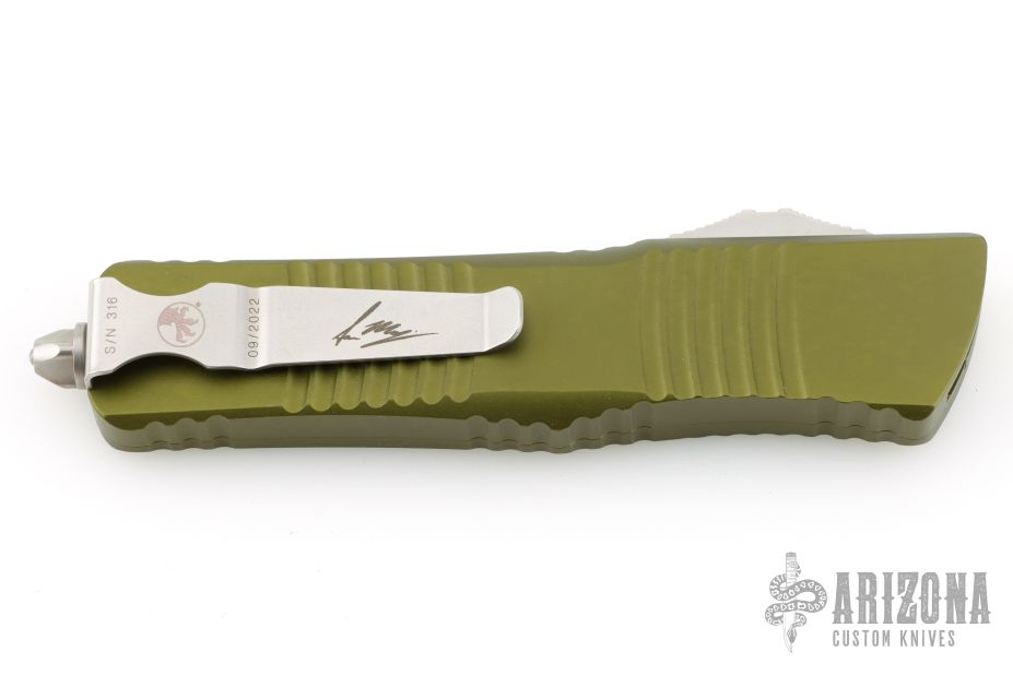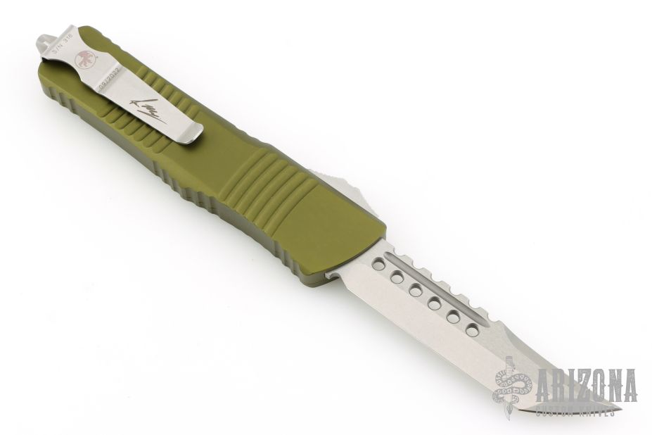 This Combat Troodon OTF automatic by Microtech knives features a stonewashed Hellhound tanto blade, and a OD Green aluminum handle with bead blasted hardware, tip down carry. Glass breaker. Dated 09/2022 S/N 316. Excellent condition. Comes with original box and papers.