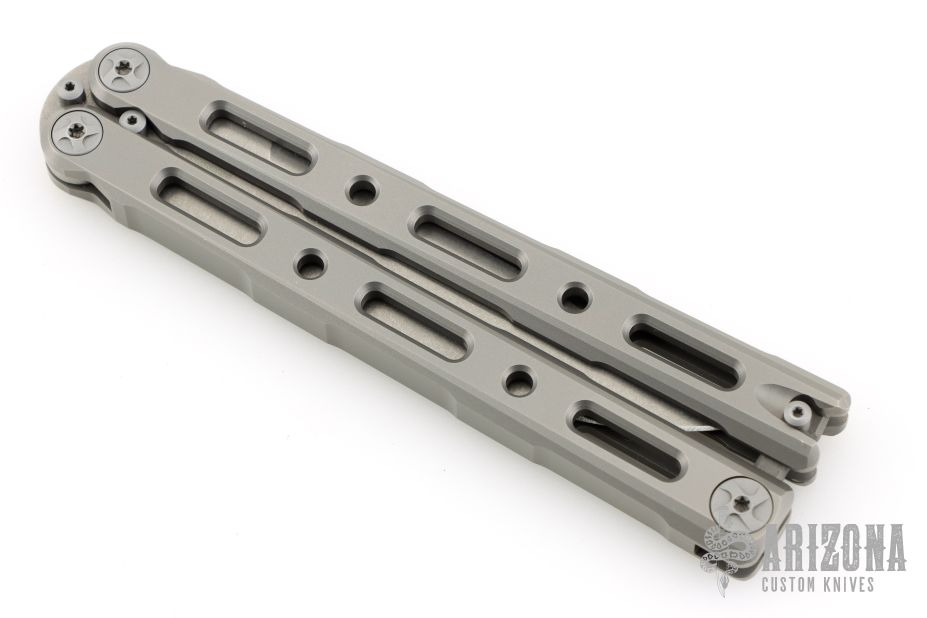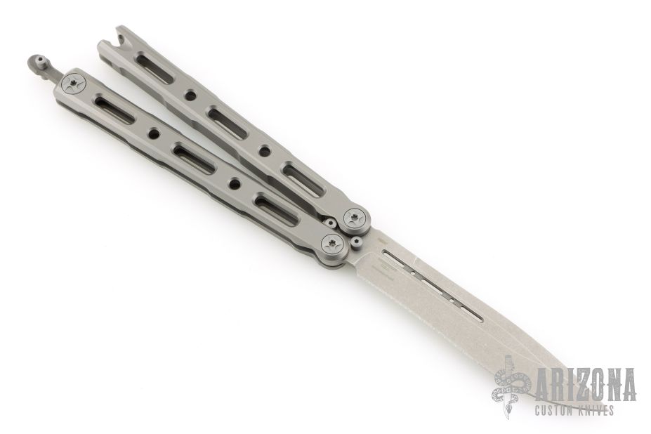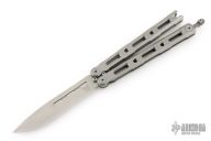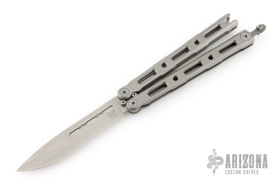 This Model 85 Balisong by Benchmade features a tumble finished blade. The handle has an integrally constructed, skeletonized titanium frame with bead blast finish. Spring-loaded T latch on pommel. Comes with original box, nylon sheath and papers. Excellent condition.