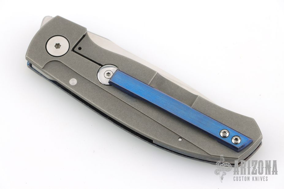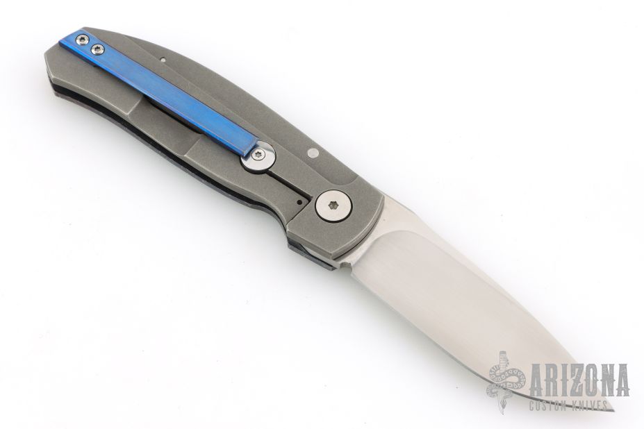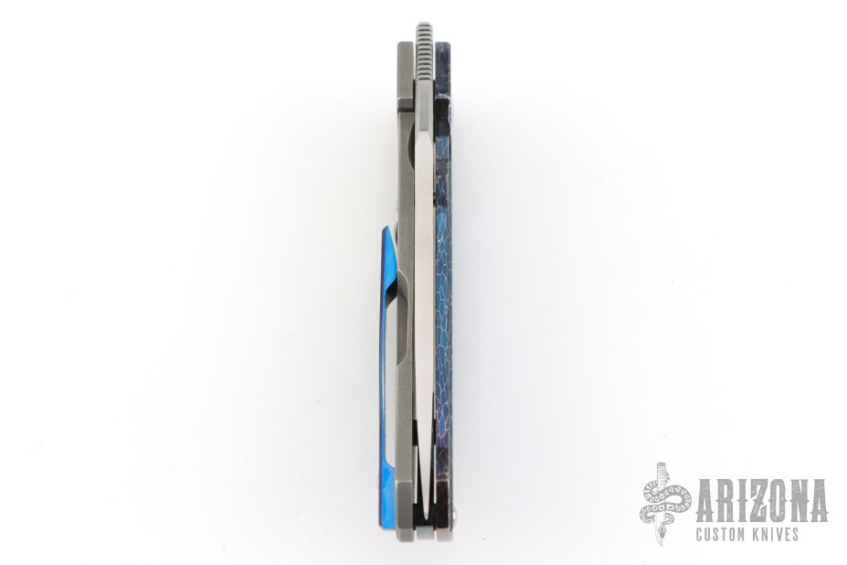 This CP1K framelock from Charl Pienaar features a hand rub satin finished blade with notched front flipper and thumbrest. The handle has a Bertie Rietveld Nebula Damascus front scale, stonewashed titanium frame with an anodized titanium tip up clip. Nice detent, lockup and blade seating. Comes in a velcro case. Excellent condition.