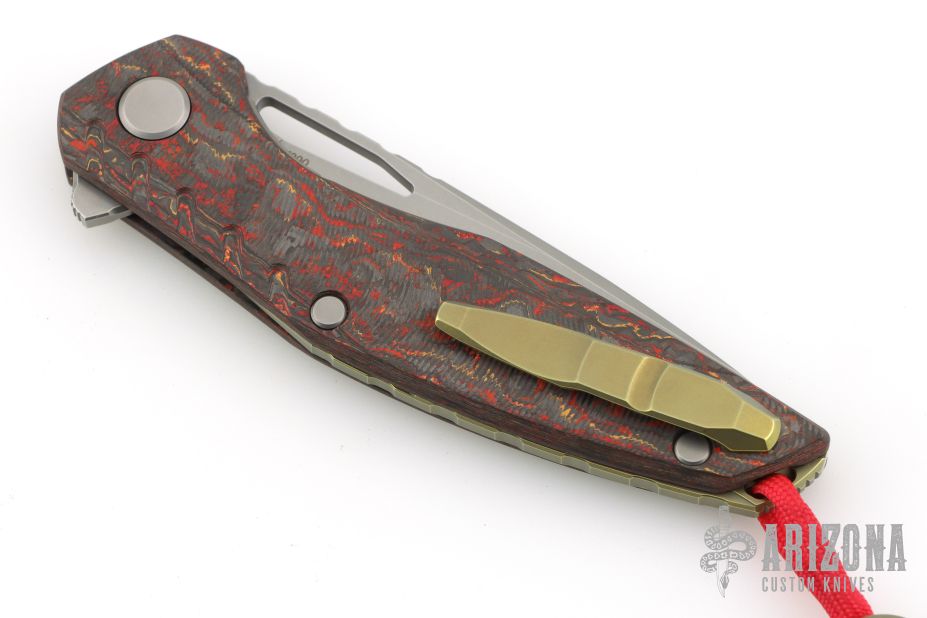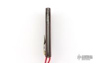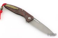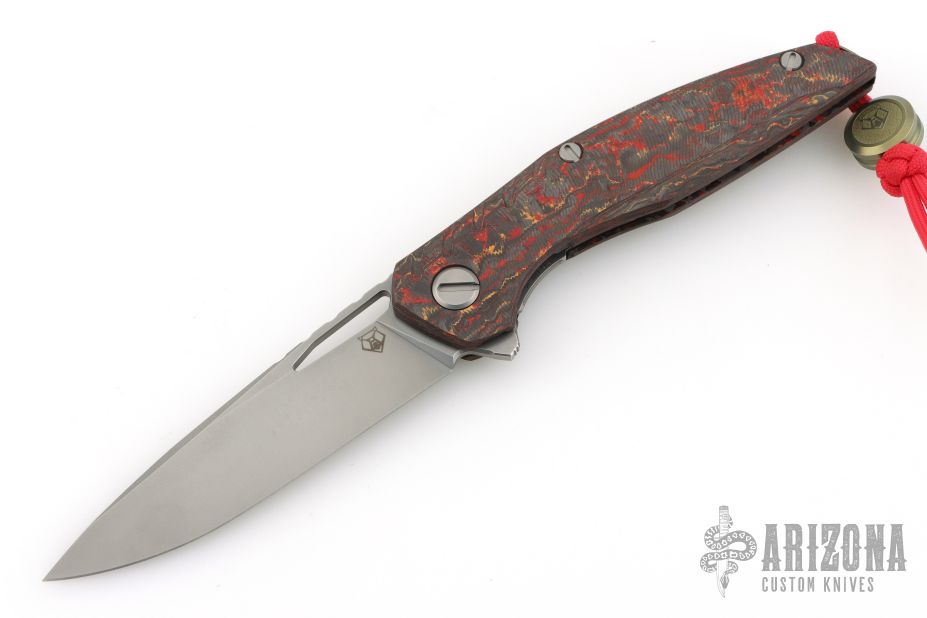 This knife features a stonewashed M390 blade with jimping and a smooth MRBS bearing system. It’s built with "Phoenix Wing" TechnoCarbo handle scales, stonewashed hardware, and an anodized titanium backspacer with lanyard hole. A red lanyard with special edition pivot bead and hidden-screw titanium pocket clip.  Comes with original box and COA dated 2025. Excellent condition.