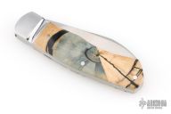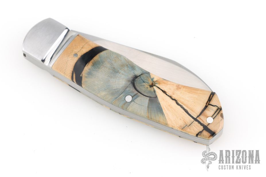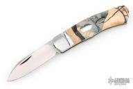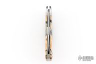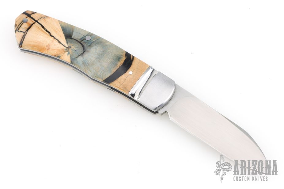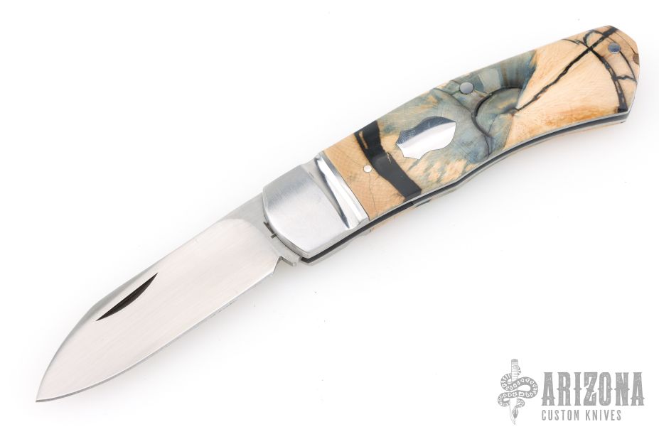 This Dino slipjoint by David Taber features a hand rub satin finished blade with nail nick. The handle has fluted stainless steel bolsters, crosscut mammoth ivory covers, stainless steel liners, escutcheon and spring. Half stop blade position, flush in all positions. Strong function. Comes with a leather slip sheath and COA dated October 2025. New from maker!